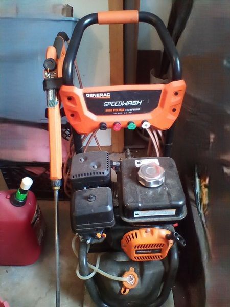 Generac Speedwash Power Washer. Generac 2900 PSI gas speedwash power washer and gas can. See photos. Items seen in background not incl. Loc in garage.