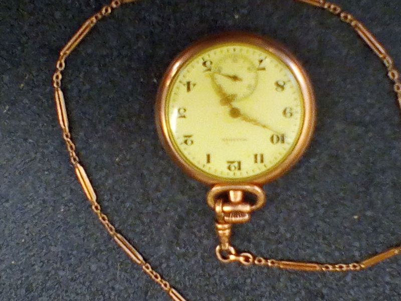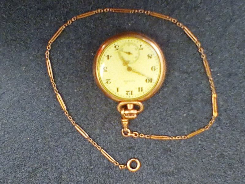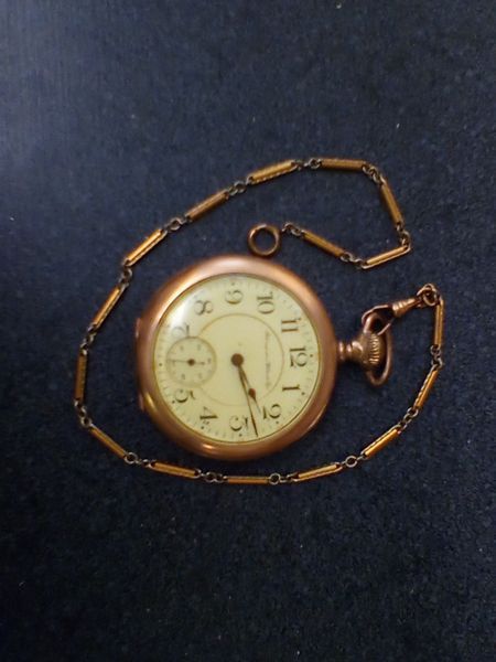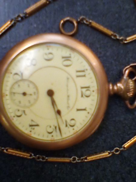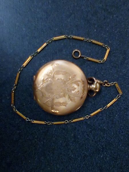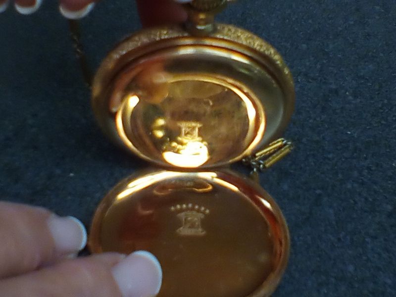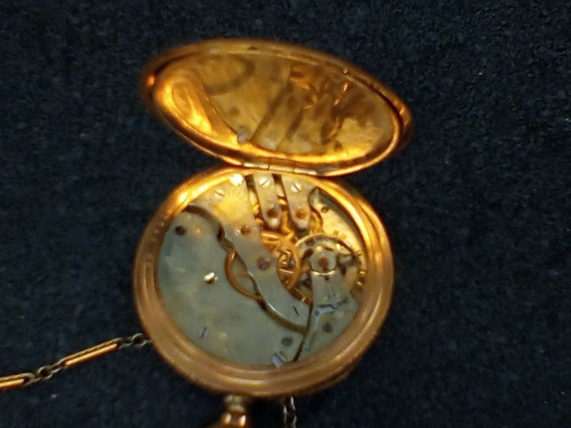 Gold Pocket watches and 10 KT Ring. Two vintage gold pocket watches with ornate cases and opens to see mechanics; 10 KT gold man's diamond and onyx ring, engraved "Forever Yours". See photos for details.