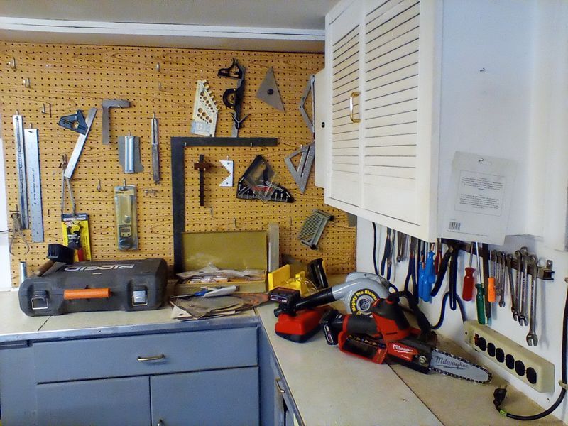 Rigid Drill, Milwaukee Chain Saw. Contents of counter and wall incl, Rigid right angle drill in case; Milwaukee mini chain saw; Mighty mini blower; measure; screwdrivers; wrenches, as seen on wall. Loc in basement near garage.