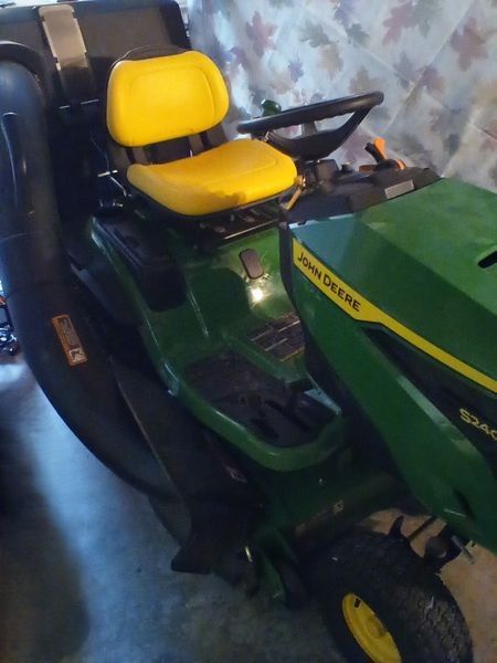 John Deere Riding Mower with Bagger. John Deer riding mower S240, 42" deep with bagger. Seller states "It is a year old & in working order." Located in the garage.