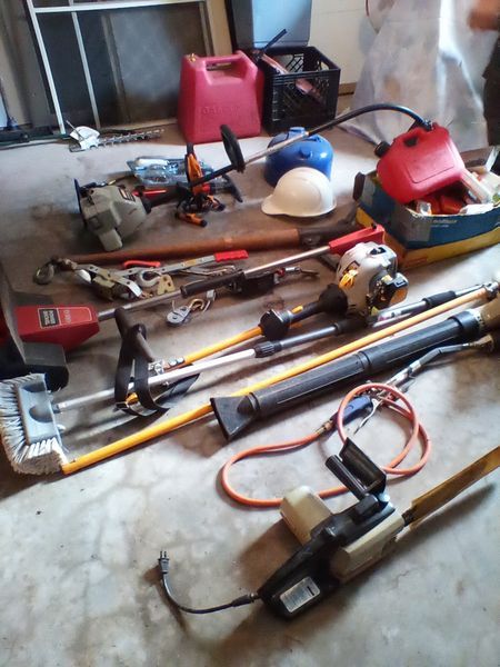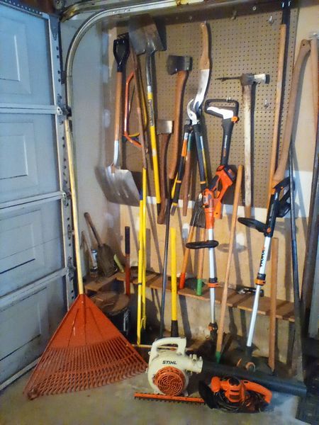 Lawn and Garden Tools, featuring Stihl. Tools incl: rakes; shovels; axes; Stihl gas leaf blower; Black & Decker Wedge elect hedge trimmer; B&D weedwhacker; other items as seen in photos. Loc in garage.