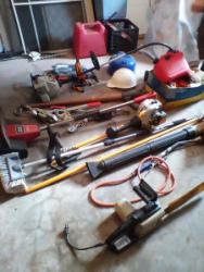 Lawn Tools and Equipment. Ryobi T30 trimmer; Craftsman leaf blower; Toro power shovel; Craftsman chain saw & trimmer; pully system (come along); other items as seen on floor of garage, incl hard hat and gas cans. Loc in garage.
