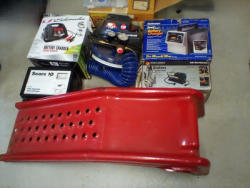 Automotive Equipment, Ramps, Sprayer. Automotive incl: red vehicle ramps; air compressors; battery chargers; 20-pc access kit. Also incl Wagner boxed Precoat paint sprayer. Loc in basement near garage.