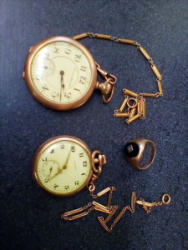 Gold Pocket watches and 10 KT Ring. Two vintage gold pocket watches with ornate cases and opens to see mechanics; 10 KT gold man's diamond and onyx ring, engraved "Forever Yours". See photos for details.