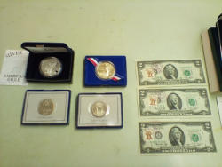 Collectible Silver Coins and $2.00 Bills. Silver coins incl: Korean War 1953-1991 proof $1.00; 2000 American Eagle (Walking Liberty silver bullion); 1986 Ellis Island State of Liberty $1.00; two 1986 Nation of Immigrants 50 cents (uncirculated); three series 1976 $2.00 with 13 cent stamps and Vernon Rockville cancellation.