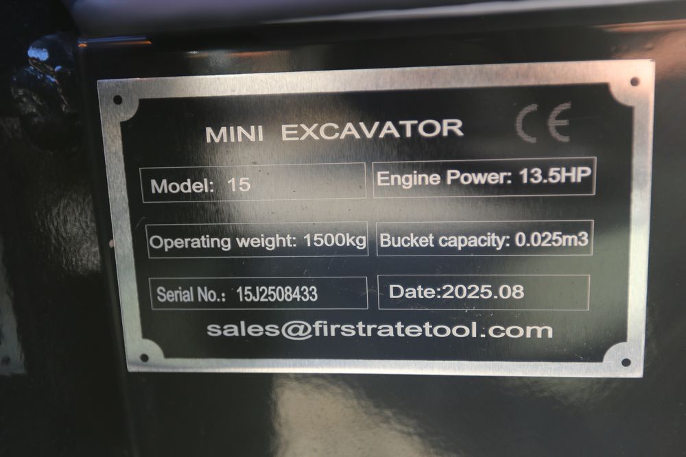 New 2026 MIVA Crawler excavator model VA15 w/ thumb, tracks, 13.5 HP engine. Hours reading less than one hour.