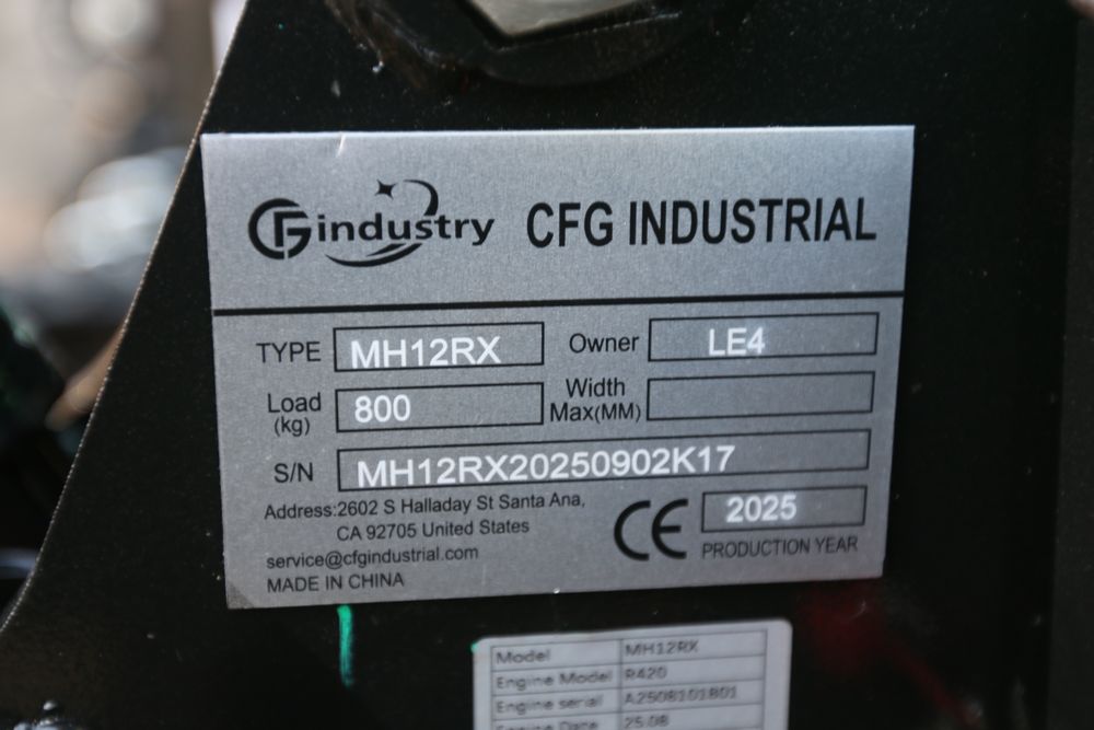 New 2025 CFG Industrial MH12RX mini excavator with bucket, thumb, gas engine. Hours reading less than 1 hour.