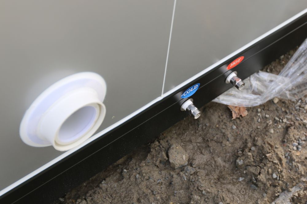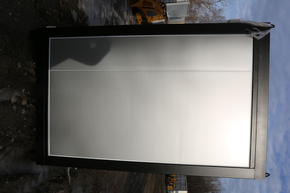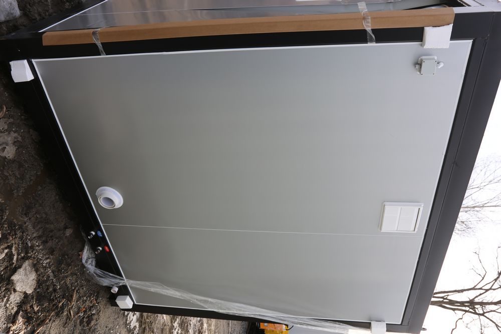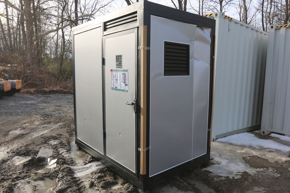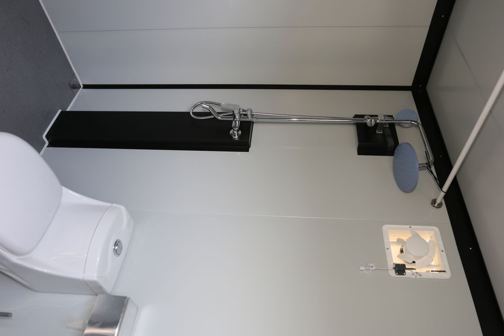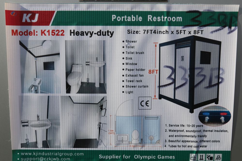 New 2025 KJ portable restroom 7'4" X 5' X 8', includes shower, toilet, toilet brush, sink, window, paper holder, exhaust fan, towel rack, shower curtain, light, model K1522. See photos for damage.