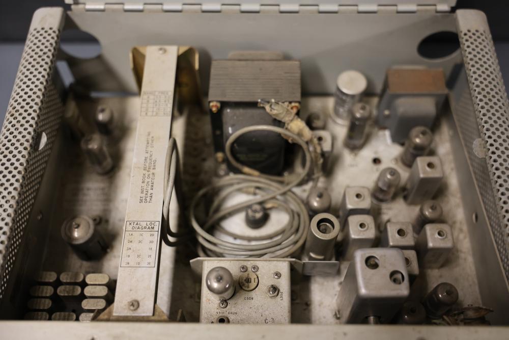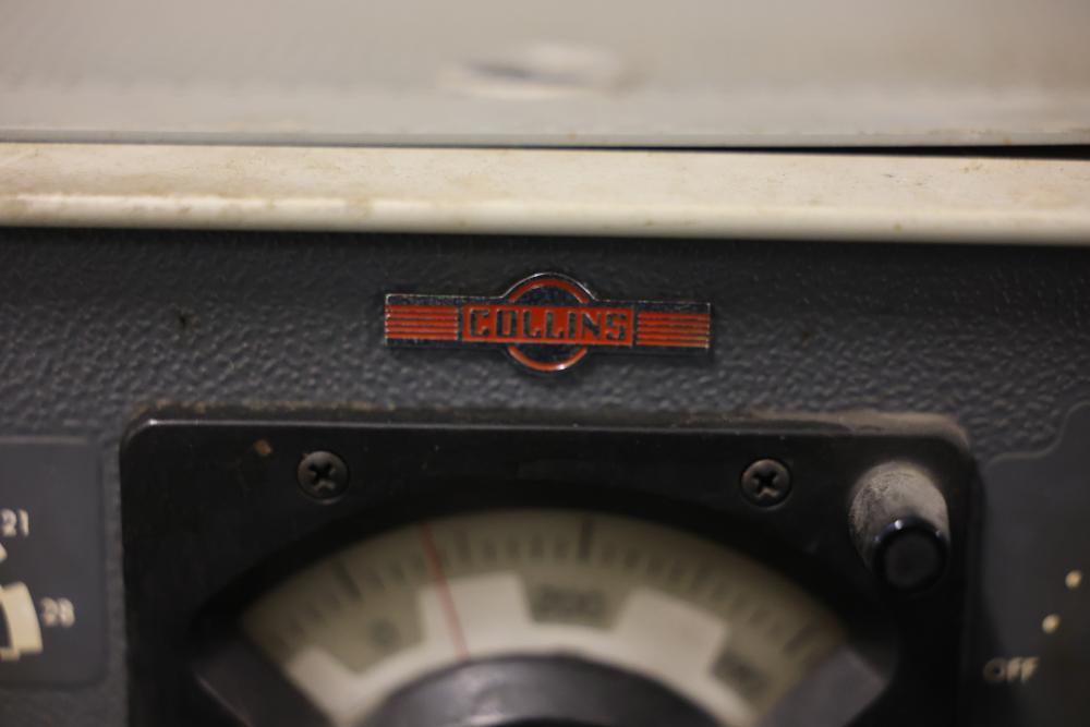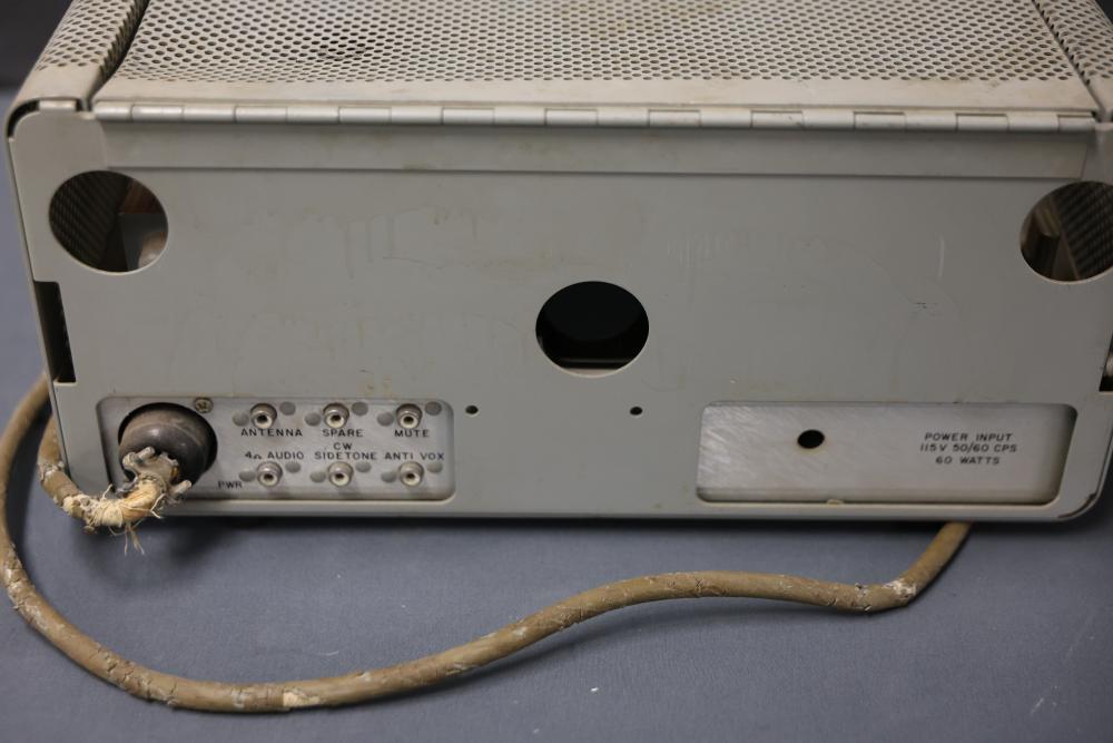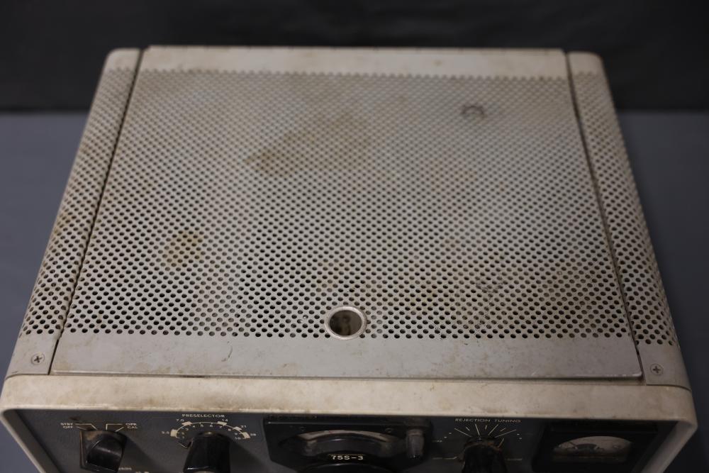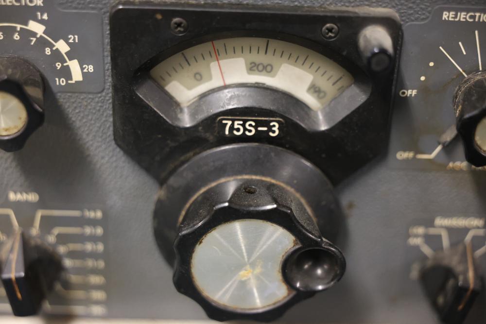 Collins 75S-3 Winged Emblem Vintage Ham Radio Receiver. The receiver includes its original instruction manual. The unit displays wear consistent with age and usage, including visible discoloration, cable fraying, and dust accumulation inside. The external casing shows wear on the metal mesh. The power requirements are listed as 115V, 50/60 CPS, 60 watts. Pickup only.
