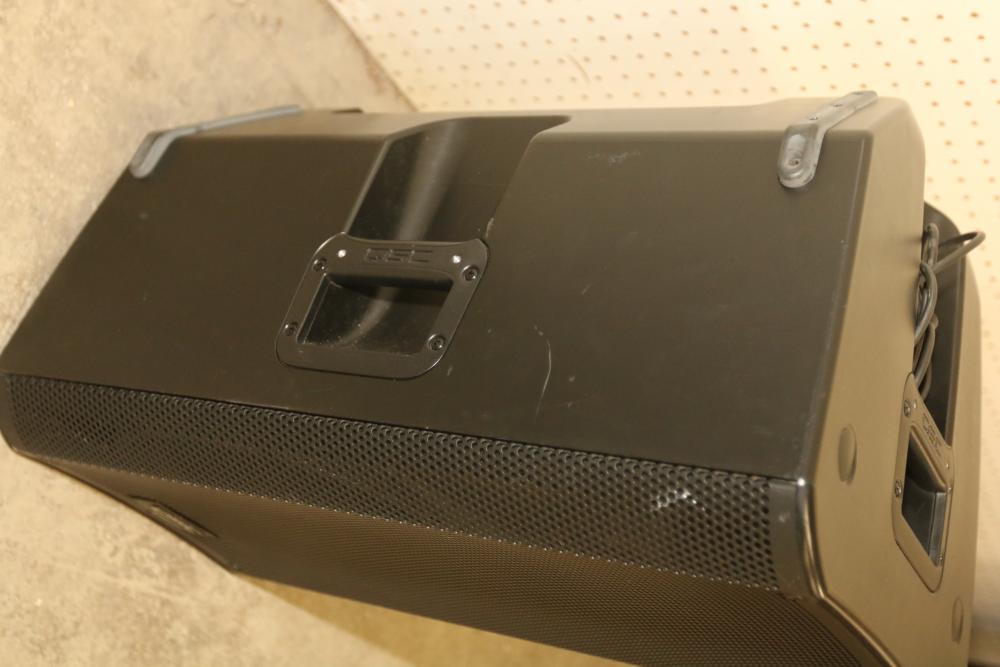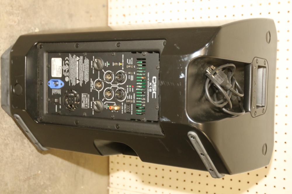 QSC K12 12 Inch 1 Kilowatt Powered PA Speaker with Carrying Case. Includes a powered 12-inch speaker capable of handling 1 kilowatt of power and a protective carrying case. The speaker has an integrated handle and input panel with various connectivity options for professional audio use. Pickup only.