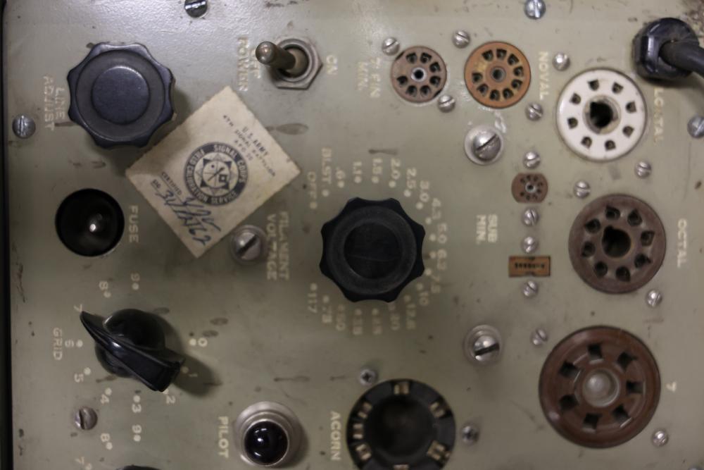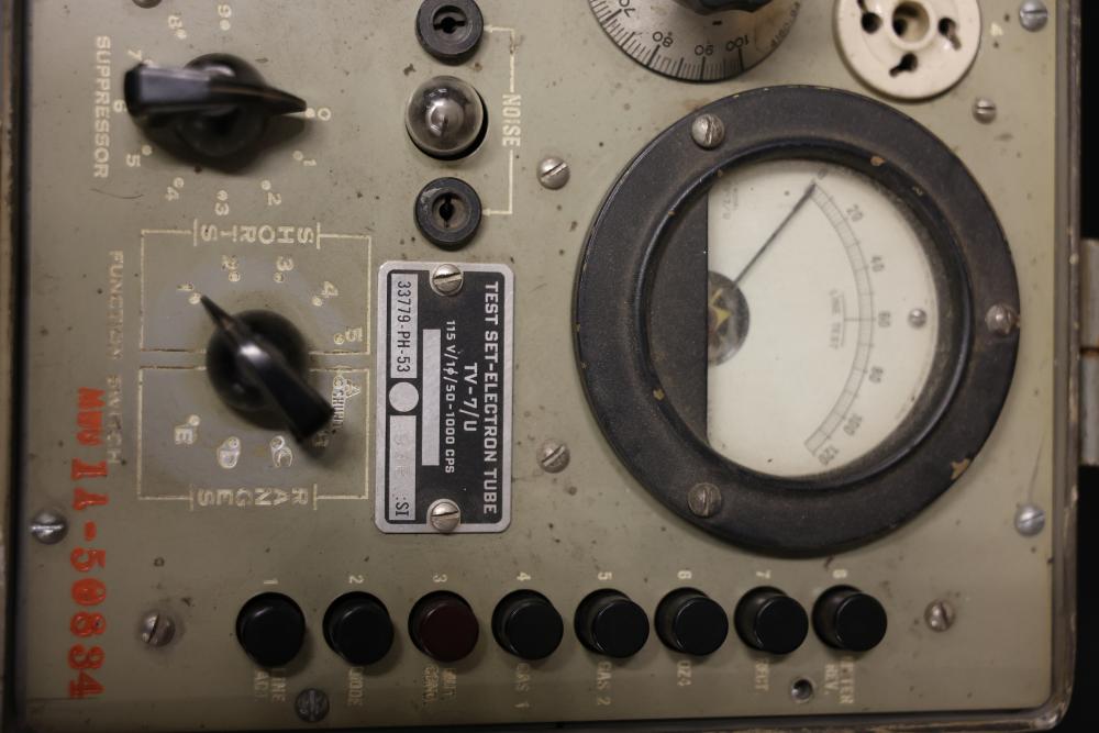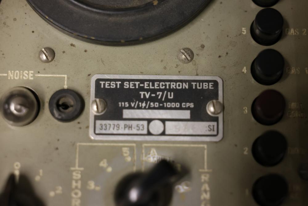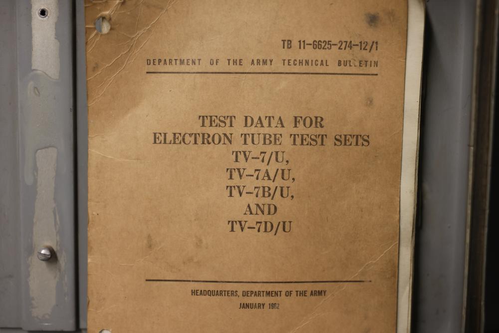Vintage TV-7/U 33779-PH-53 Military Test Set Electron Tube Tester. This unit includes a metal carrying case, test data manual, power cord, and various connection points for electron tube testing. The outer case shows wear consistent with age and use. Pickup only.
