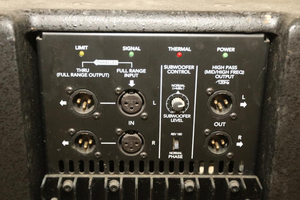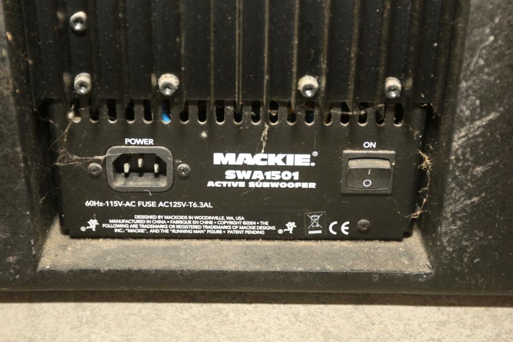 Mackie SWA1501 15 Inch Active Powered Subwoofer featuring a 15-inch speaker, active power amplification, and multiple input/output options. Includes controls for subwoofer level and phase adjustment. Designed for professional sound reinforcement. Pickup only.