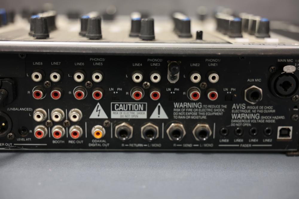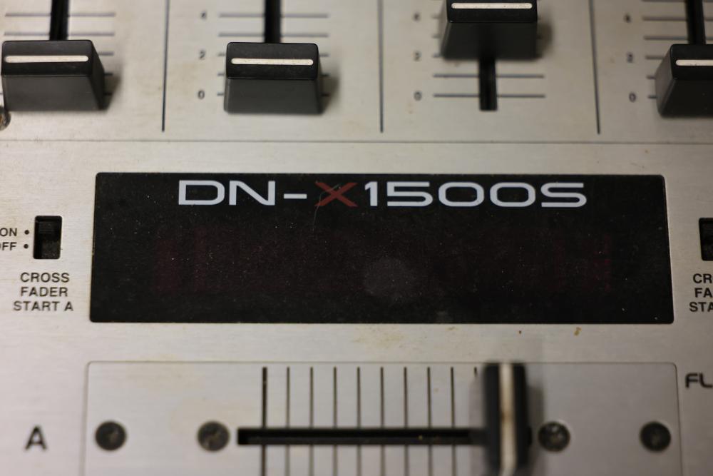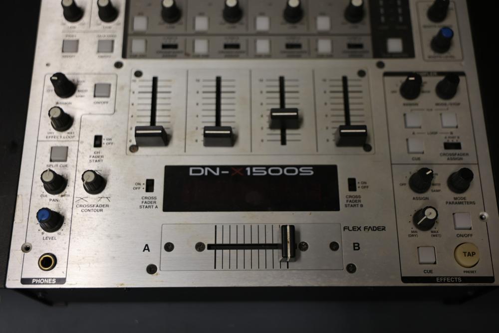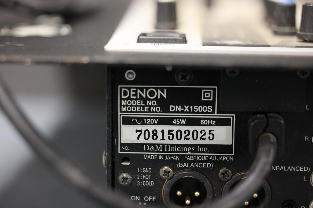 Denon DJ DN-X1500S 4-Channel DJ Mixer. Features control knobs, faders, input/output connections, and a power cable. Designed for professional DJ settings with multiple audio channel options. Model includes balanced and unbalanced output ports and digital and analog input compatibility. Pickup only.