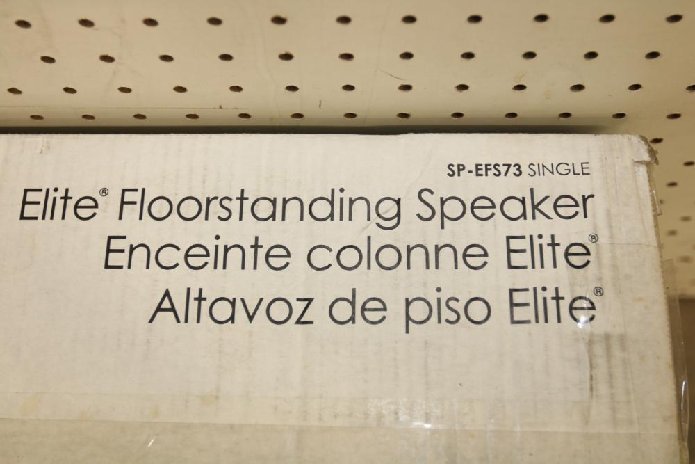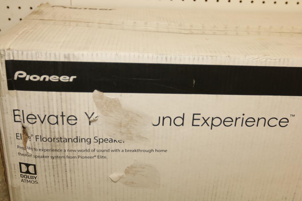 Pioneer Elite SP-EF573 Andrew Jones Home Audio Floor Standing Speaker, Set of 2. Includes original packaging and features specifications such as 3-way bass-reflex configuration, frequency response of 38 Hz to 20 kHz, and sensitivity rated at 86 dB. Each speaker has a nominal impedance of 4 ohms and comes with black vinyl finish. Dimensions with grille are 237 mm x 1008 mm x 220 mm, and each speaker weighs approximately 35.3 lbs. Pickup only.