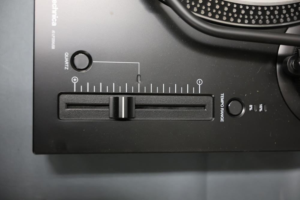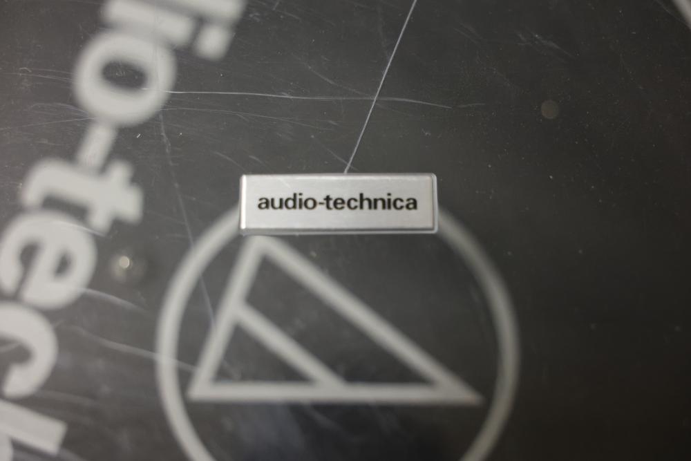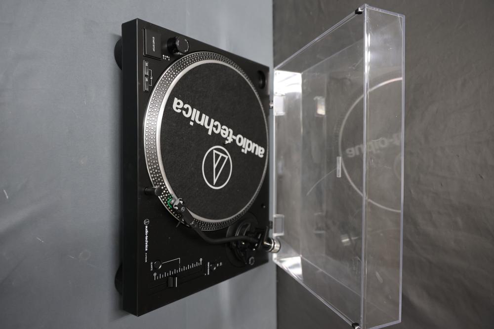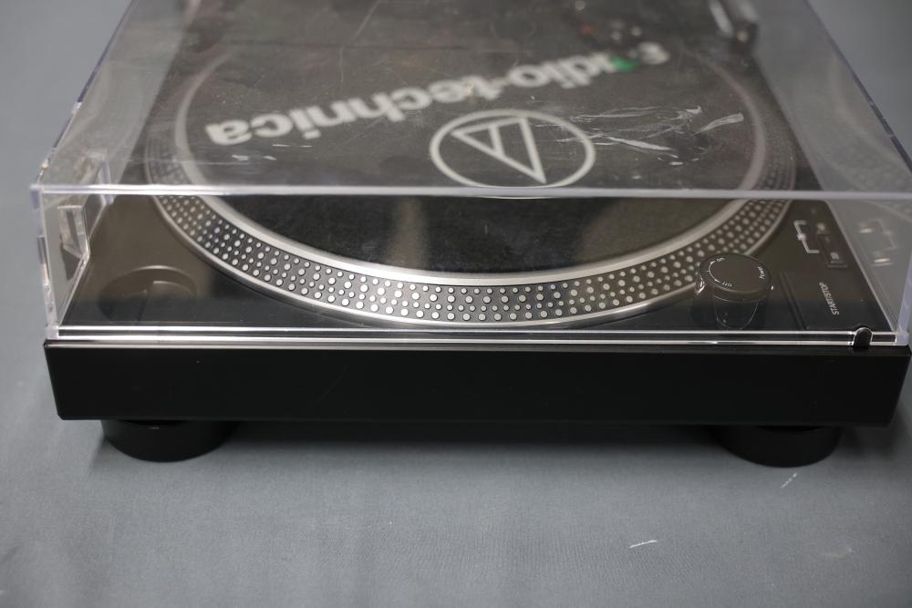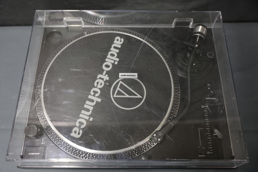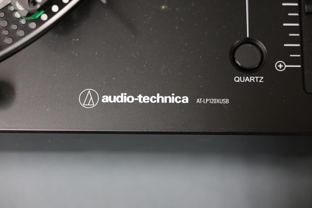 Audio-Technica AT-LP120XUSB Direct Drive DJ Turntable. Includes a power adapter and additional components as depicted. Unit features direct drive operation, quartz speed control, pitch adjustment slider, and support for 33, 45, and 78 RPM playback speeds. Dust cover is included. Pickup only.