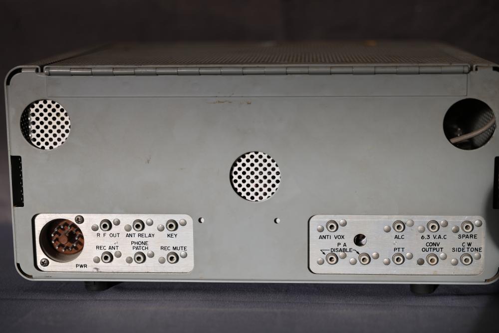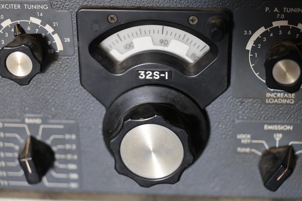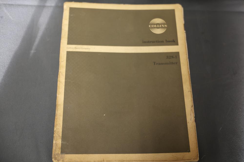Collins 32S-1 Winged Emblem Vintage Ham Radio Transmitter. Includes the manual. Features a metal housing, various tuning and control dials, and connections on the rear panel. Displays the '32S-1' marking and Collins winged emblem on the front. Condition shows wear consistent with age and use. Pickup only.