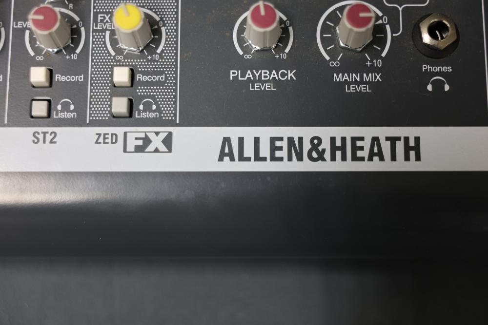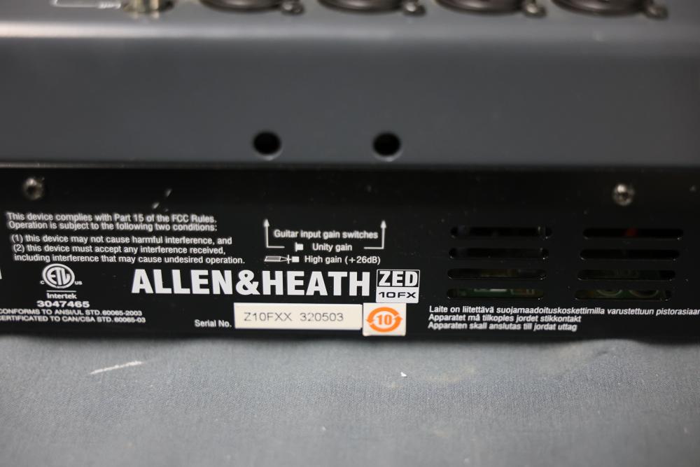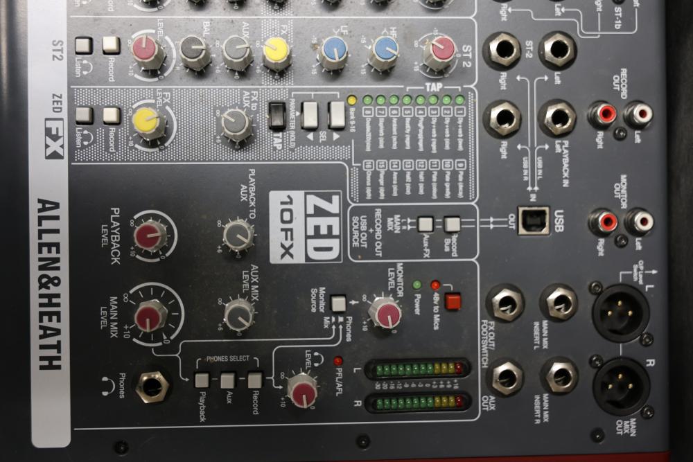 Allen and Heath ZED-10FX Multipurpose Miniature DJ Mixer. Features include multiple input options, USB connectivity, effects, and comprehensive level controls. Includes power cable. Pickup only.