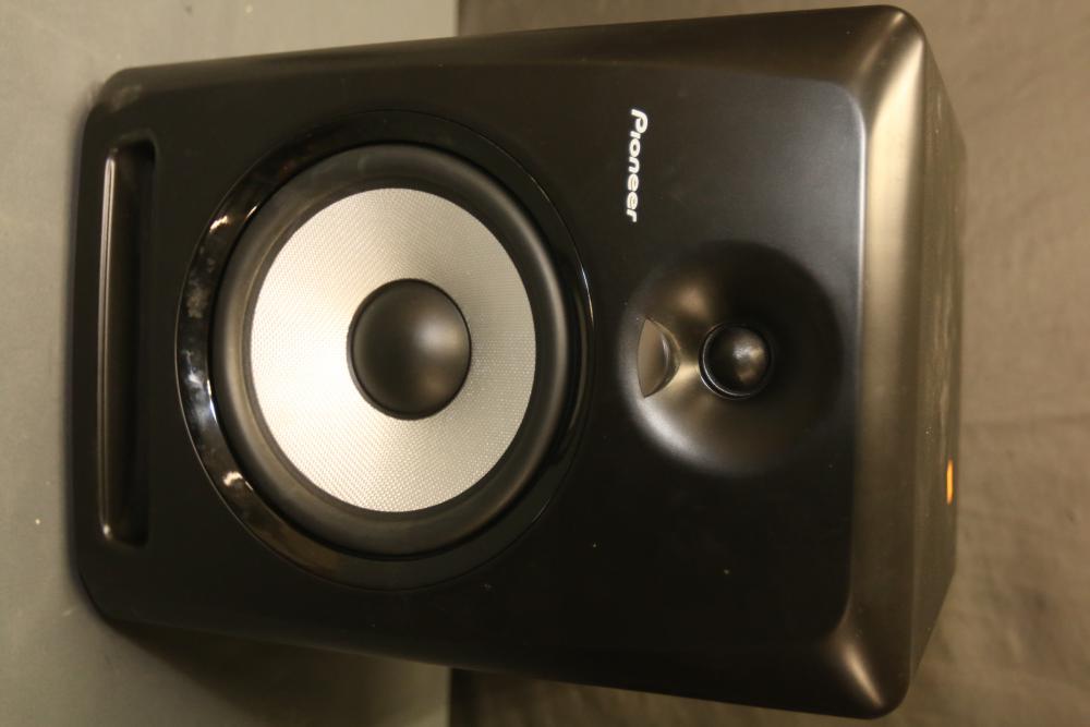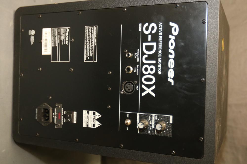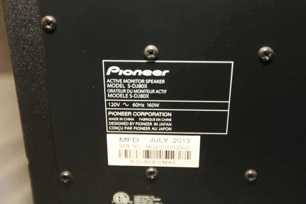 Pioneer S-DJ80X 8 Inch Active Reference DJ Speaker, Set of 2. Includes two speakers as part of the active reference monitor system with an 8-inch driver. Features inputs for unbalanced RCA, balanced TRS, and XLR connections. Units show signs of wear including visible edge damage. Power cords included. Pickup only.
