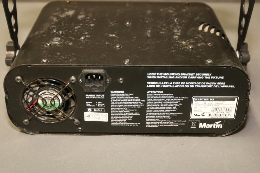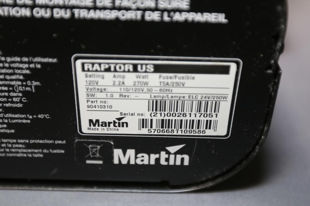 Martin RAPTOR DJ Effect Light featuring a durable metal housing, power cord, and original albeit heavily worn packaging. Includes mounting bracket and rear connection details showing compatibility for 120V/240V operation. The unit shows visible signs of use, including dust and cosmetic wear. Pickup only.