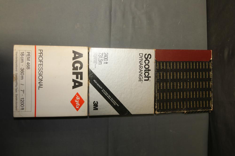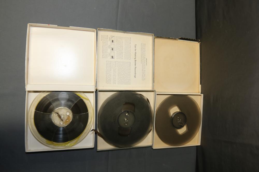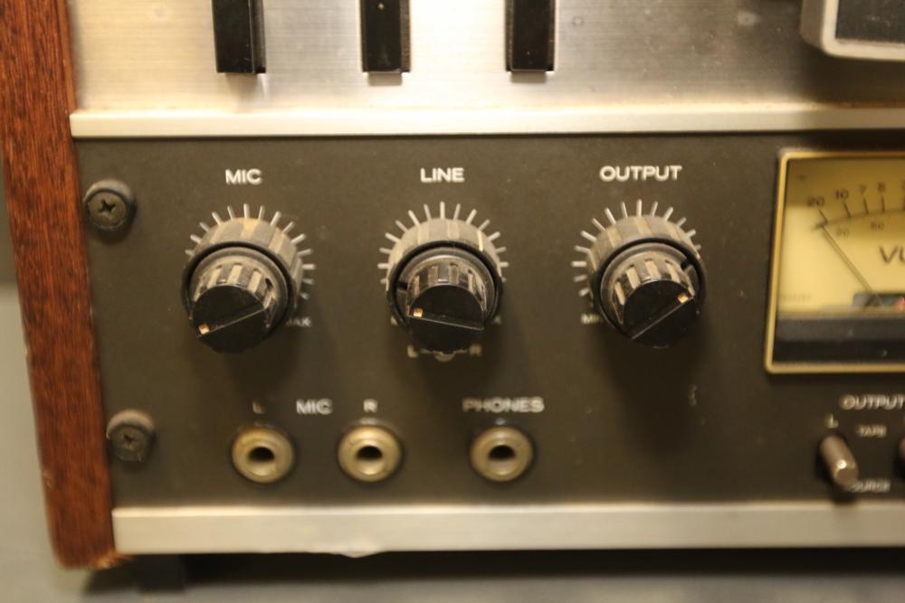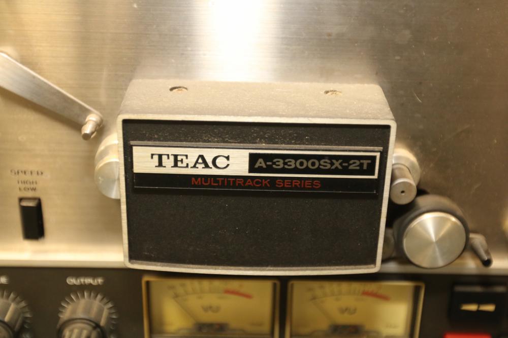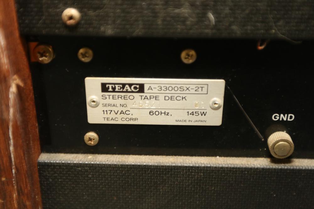 Teac A-3300SX-2T 10.5 Inch 4 Track Stereo Reel to Reel Tape Recorder with additional recording play tapes. Features include VU meters, mic, line, and output controls, and 2 track master recorder functionality. Comes with accessories including Scotch and Agfa recording tapes. Unit shows visible wear. Pickup only.
