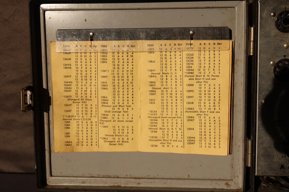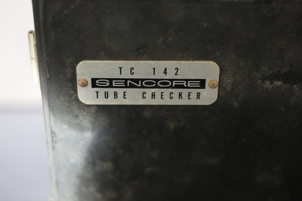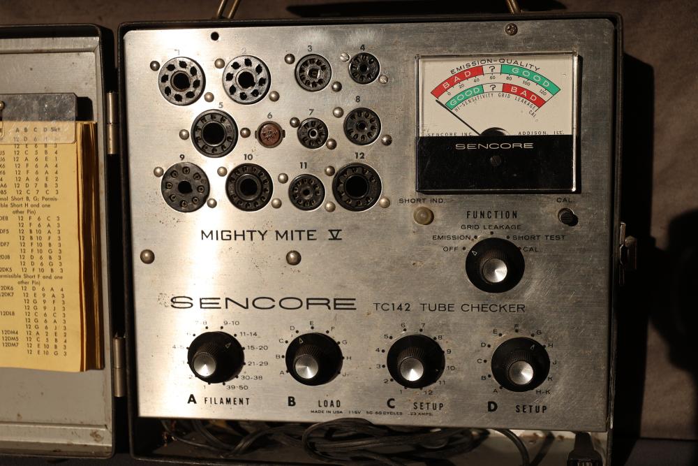Vintage Sencore TC 142 Mighty Mite V Tube Checker. This device features a sturdy case with a handle, a variety of tube sockets, a meter for testing functionality, and controls for filament, load, and other settings. The inside lid includes a reference chart for tube testing. Pickup only.
