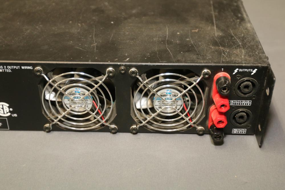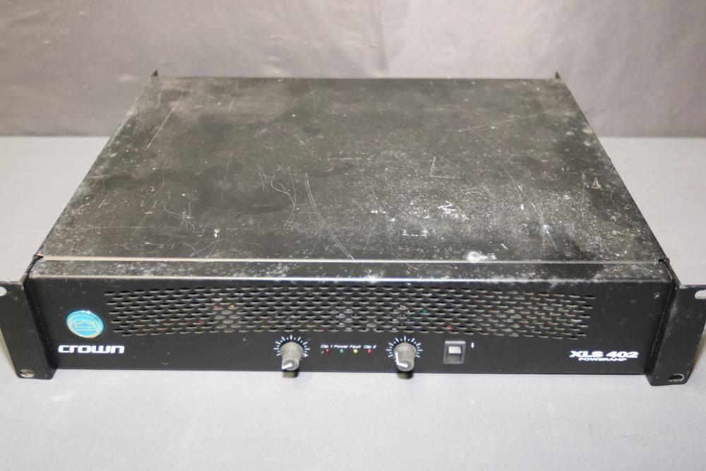 Crown XLS402 1300 Watt 2-Channel Power Amplifier. Features include two input connections, dual output connections, ventilation fans, and a power cable. The unit shows signs of wear and use, with visible surface scratches and scuffs. Fully functional hardware and control knobs are intact. Pickup only.