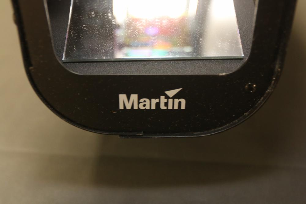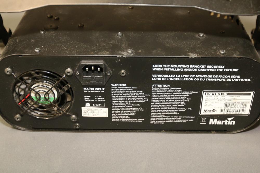 Martin RAPTOR DJ Effect Light. The unit features a durable housing, integrated mounting bracket, and power cord. Designed for producing dynamic lighting effects. Shows signs of use, including surface wear. Power specifications: 120V, 2.2A, 270W, with an ELC 24V/250W lamp. Pickup only.