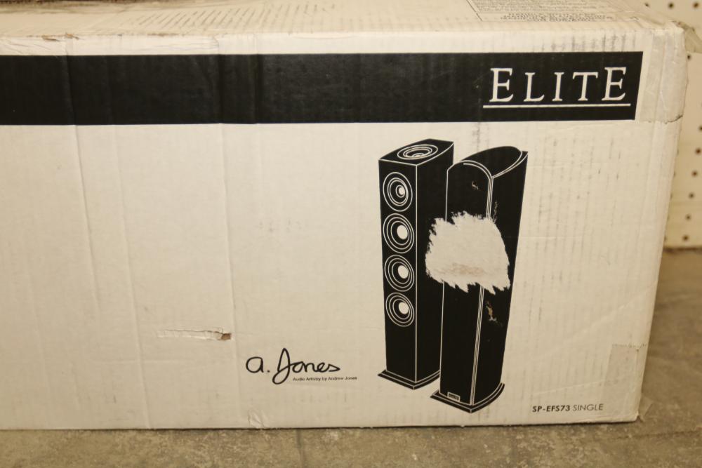 Pioneer Elite SP-EF573 Andrew Jones Home Audio Floor Standing Speaker. This speaker is designed to enhance the home audio experience with its advanced features and design by Andrew Jones. The speaker is packaged in its original box with protective materials. Pickup only.