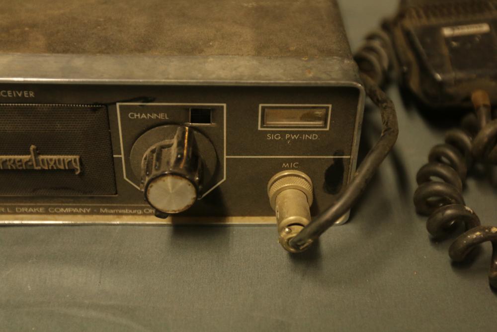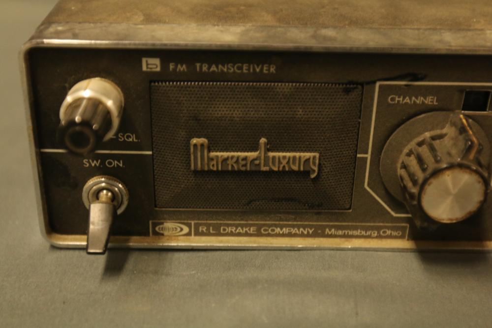 R.L. Drake Market Luxury ML-2 Vintage VHF FM Ham Radio Transceiver with Primo DM-1391 Vintage Handheld Microphone. Includes channel dial, SQL and power options, and microphone connectivity. Back panel provides additional input and fuse details. Item shows signs of wear consistent with age. Pickup only.