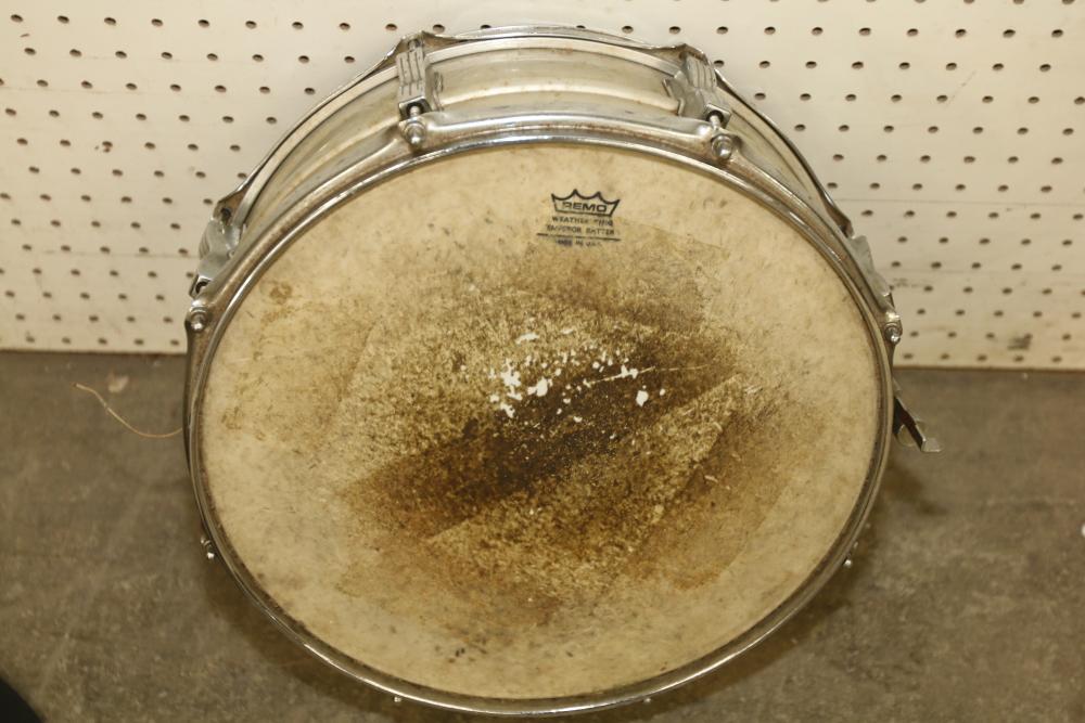 Pearl P-902 Power Shifter Double Bass Drum Pedal, Tama Iron Cobra 200 Series Hi-Hat Stand, 14-inch Ludwig Snare Drum with an Evans 14-inch drum head, and a collection of drumsticks. Includes a storage case for the drumsticks. Suitable for drummers seeking reliable, versatile equipment. Pickup only.