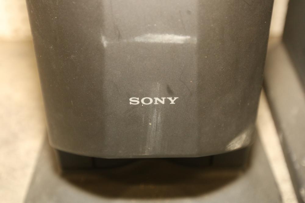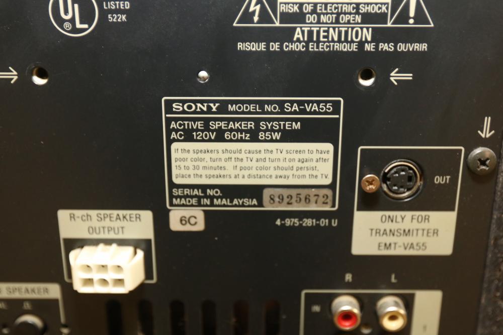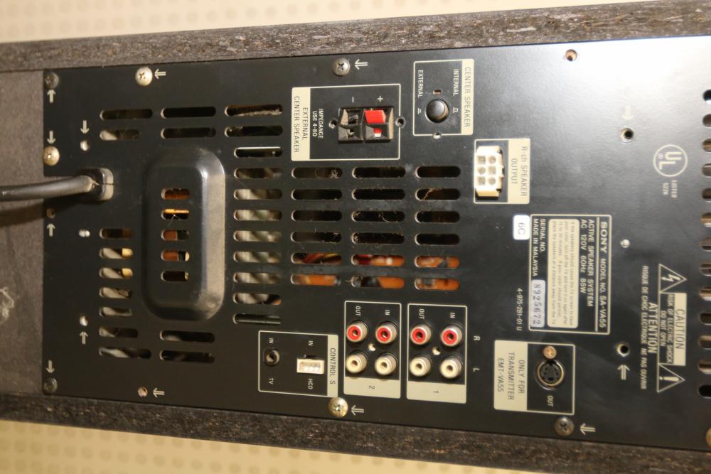 Sony SA-VA55 Floor Standing Active Power Speaker Pair with Link Cable and Wireless Transmitter. Includes link cable and wireless transmitter. Remote is not included. Speakers show signs of wear consistent with previous use. Pickup only.