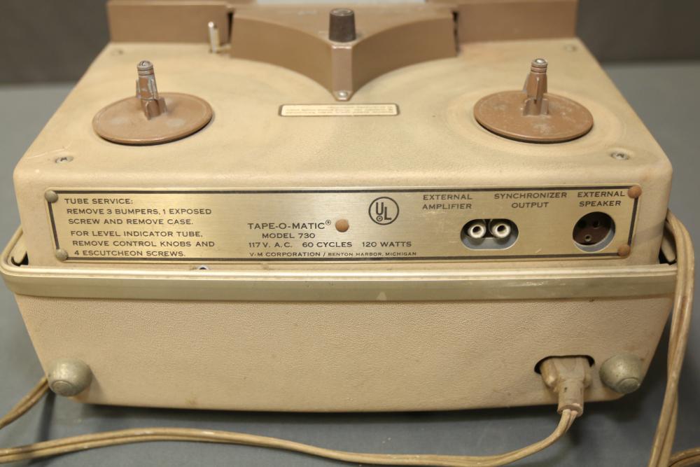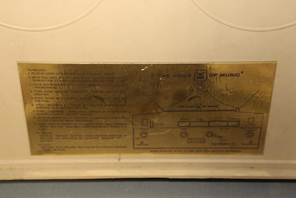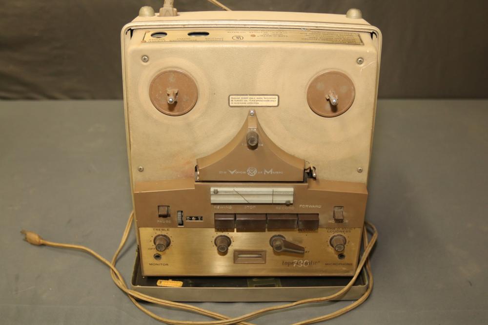 N/F Voice of Music Tape-O-Matic Model 730 Vintage Stereo Tube Reel to Reel Tape Deck. This tube-based reel-to-reel tape deck features playback, recording, and tone adjustment controls. The unit is currently not functioning. Pickup only.