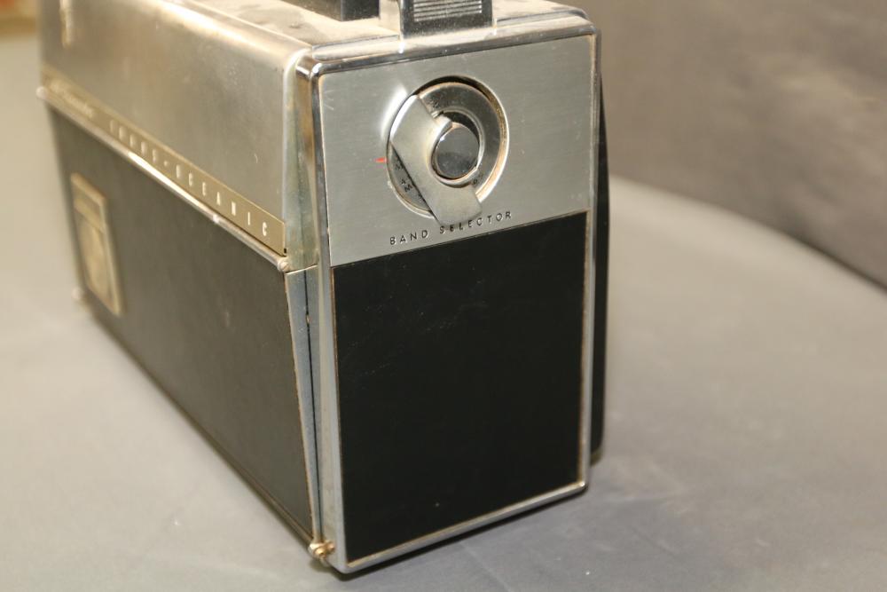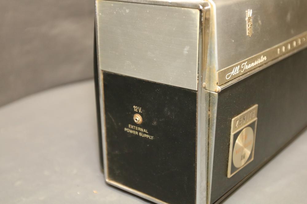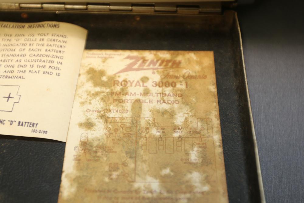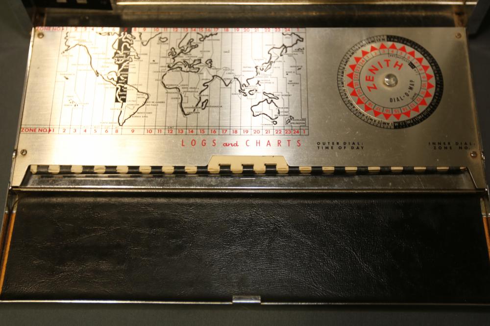 Vintage Zenith Trans-Oceanic FM/AM Multiband Royal 3000-1 Radio. Features a chrome and black exterior with a fold-out cover showcasing logs and charts. Includes dials for AM and FM tuning, external power supply input, and internal component layout. Appears to retain original labels and documentation within the compartment. Pickup only.