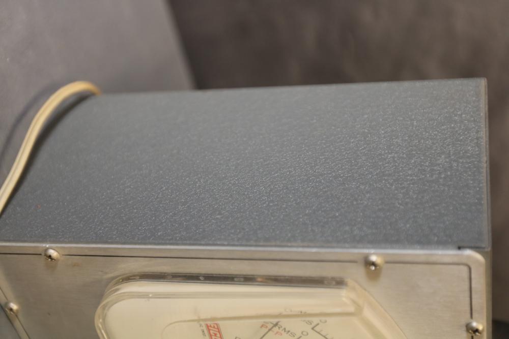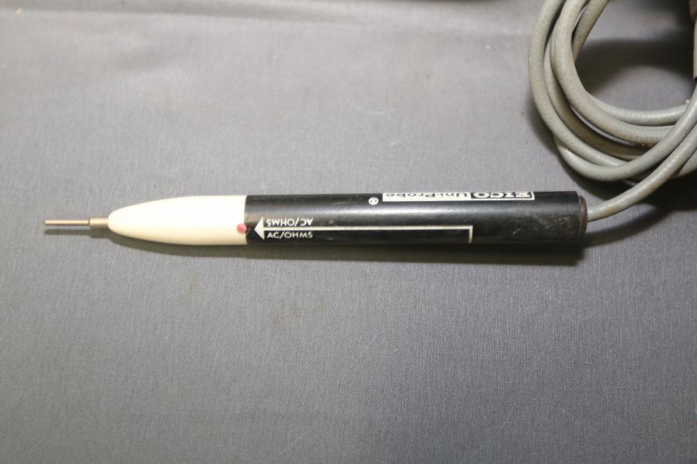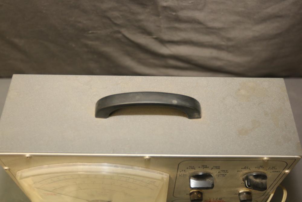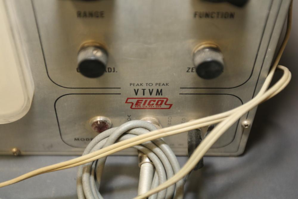 Eico Model 249 Vintage Electronic Vacuum Tube Voltmeter. Features a metal casing with a large analog display, multiple range and function knobs, and reset options. Includes attached cables and original probe. Shows visible wear consistent with age. Pickup only.