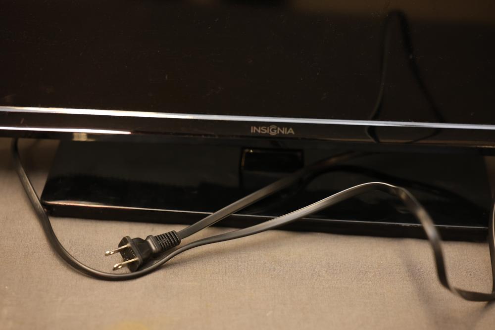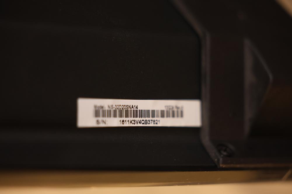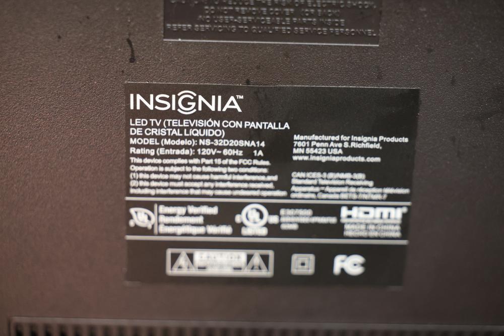 Insignia 32-Inch LED TV Model NS-32D20SNA14. Features include HDMI, USB, and digital optical output ports. Rated for 120V, 60Hz and 1A. Pickup only.