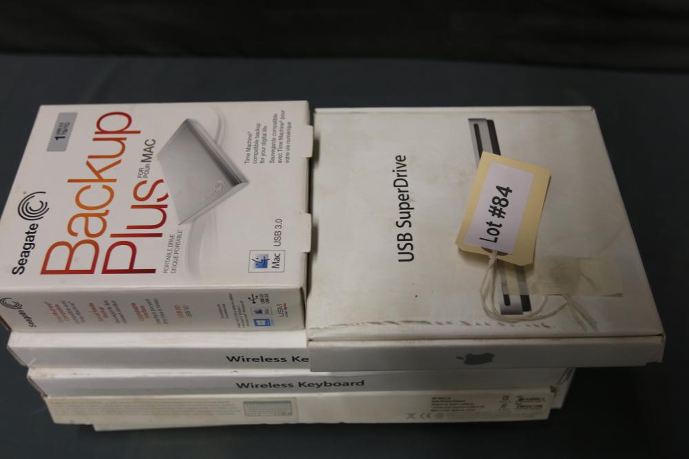 Apple and Mac Accessories with Seagate Backup Plus, SuperDrive, and Keyboards. Includes a Seagate Backup Plus 1TB Portable External Hard Drive for Mac with USB 3.0 connectivity, an Apple USB 2.0 SuperDrive Model MD564ZM/A, and four Apple Bluetooth Wireless Keyboards Model MC184LL/B. Items have original packaging. Pickup only.