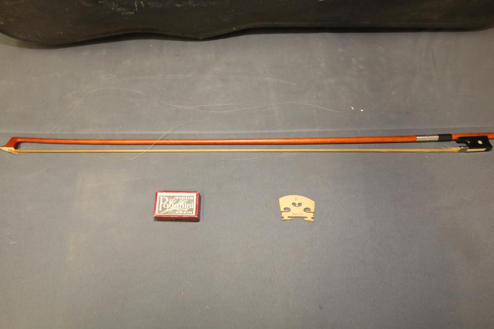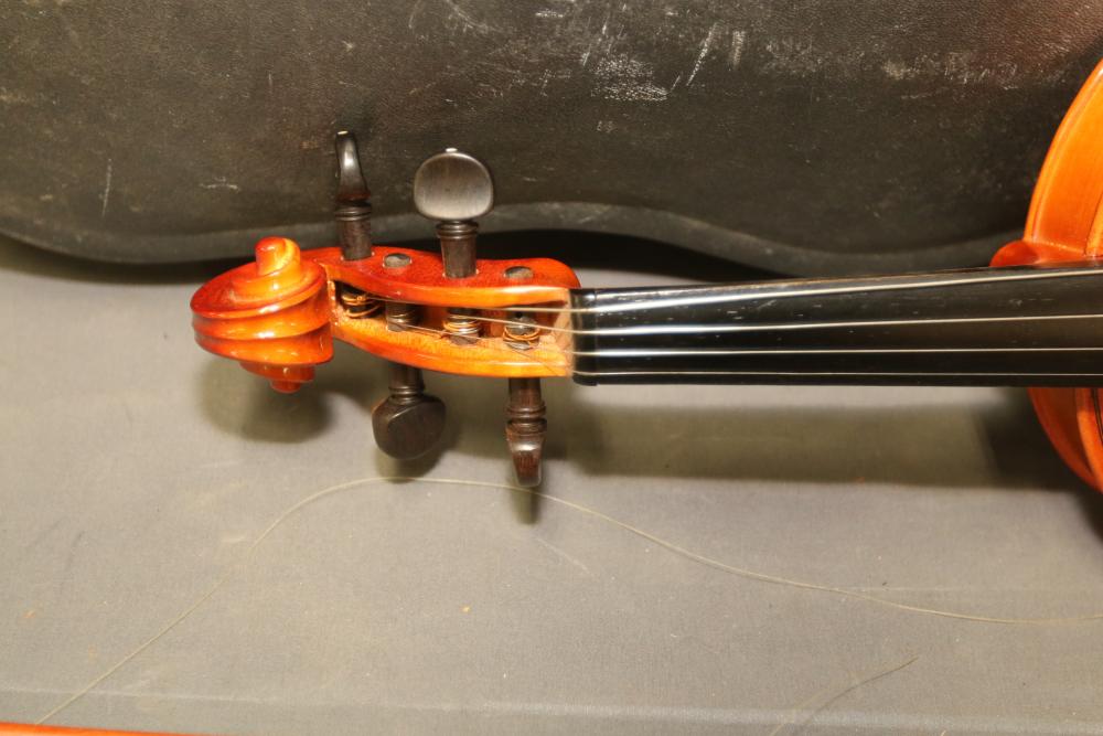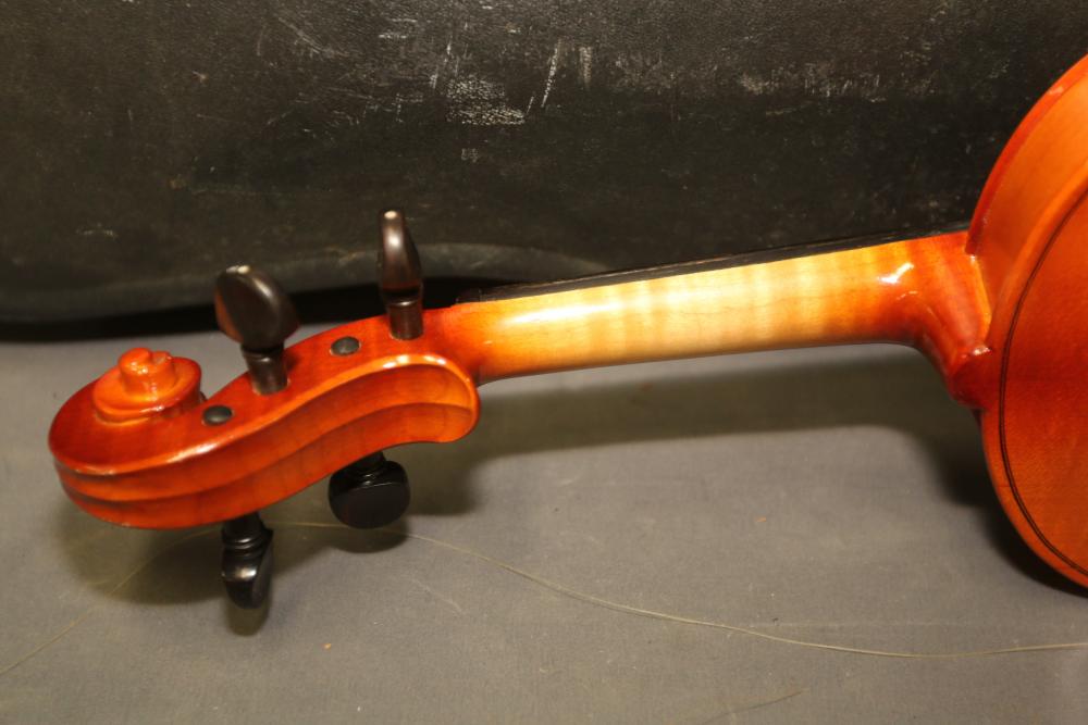 Carlo Robelli HV-100 4/4 Beginner's Violin with bow, bridge, Paganini violin rosin, and hard carrying case included. The violin shows a polished wood finish, black tuning pegs, and chin rest. The set includes all shown accessories, accommodating entry-level use. Pickup only.