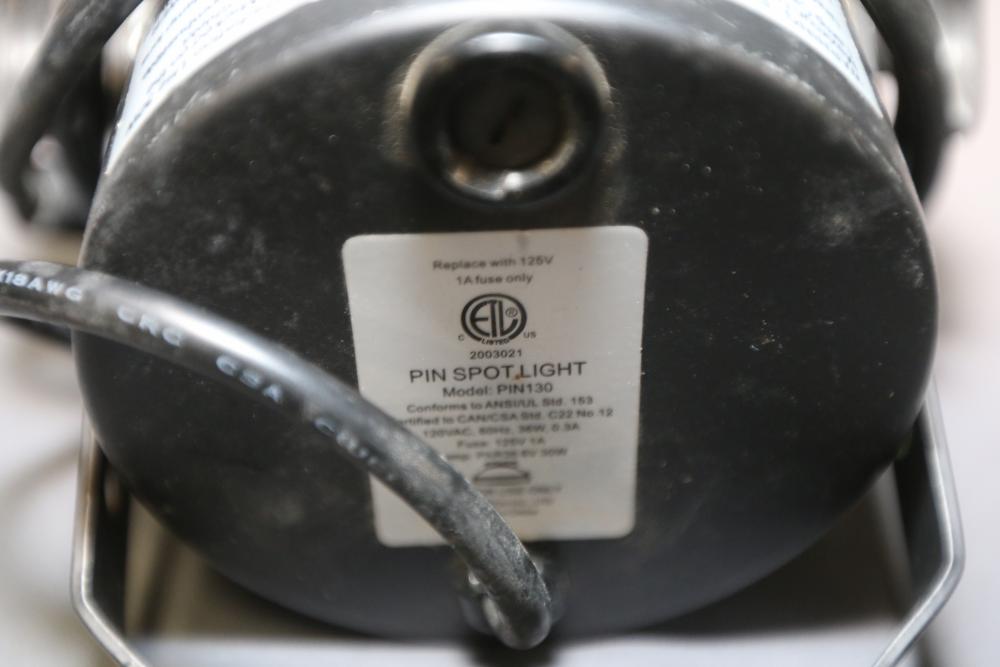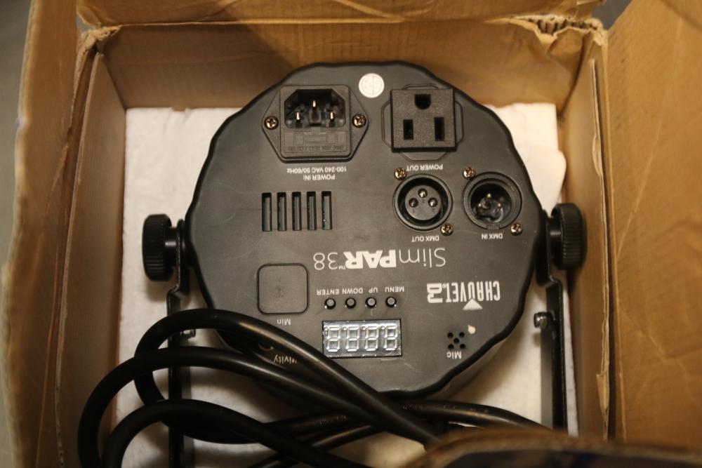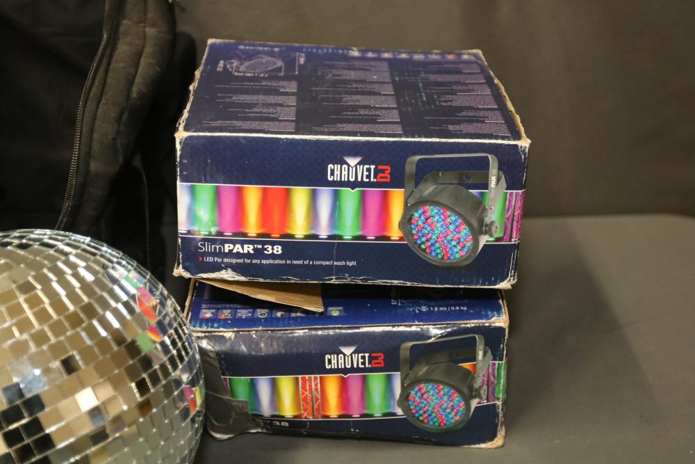 Stage Lighting Set Including Chauvet DJ SlimPar 38 LED Lights, two mirror balls with Arriba carrying cases, American DJ PL-1000 Pinspot Light, MBK-1 Pinspot Light with multicolored lenses, PIN-130 Pinspot Light, Amscan SDL-004 Strobe Light, and various mounting and hanging accessories. Includes all items shown in the photos. Pickup only.