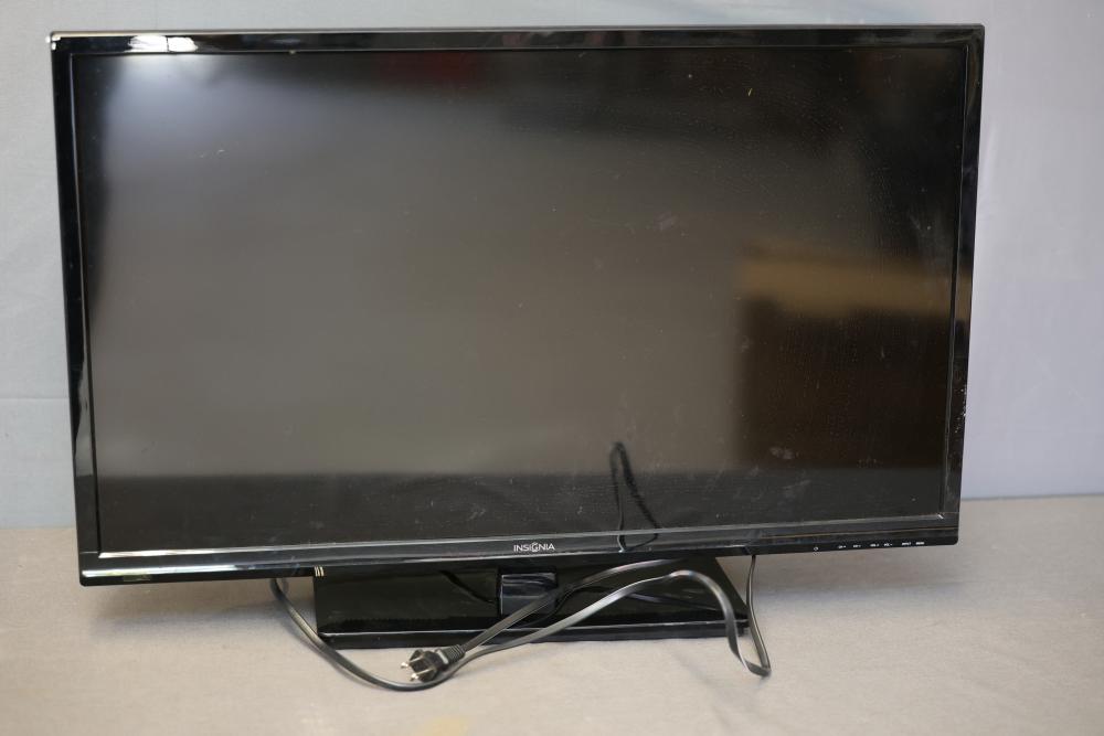 Insignia 32-Inch LED TV Model NS-32D20SNA14. Features include HDMI, USB, and digital optical output ports. Rated for 120V, 60Hz and 1A. Pickup only.
