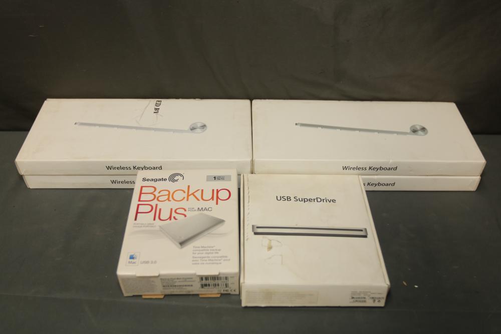 Apple and Mac Accessories with Seagate Backup Plus, SuperDrive, and Keyboards. Includes a Seagate Backup Plus 1TB Portable External Hard Drive for Mac with USB 3.0 connectivity, an Apple USB 2.0 SuperDrive Model MD564ZM/A, and four Apple Bluetooth Wireless Keyboards Model MC184LL/B. Items have original packaging. Pickup only.