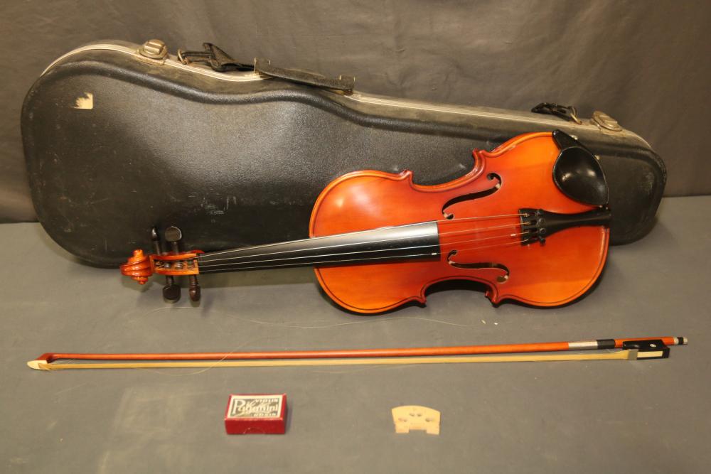 Carlo Robelli HV-100 4/4 Beginner's Violin with bow, bridge, Paganini violin rosin, and hard carrying case included. The violin shows a polished wood finish, black tuning pegs, and chin rest. The set includes all shown accessories, accommodating entry-level use. Pickup only.
