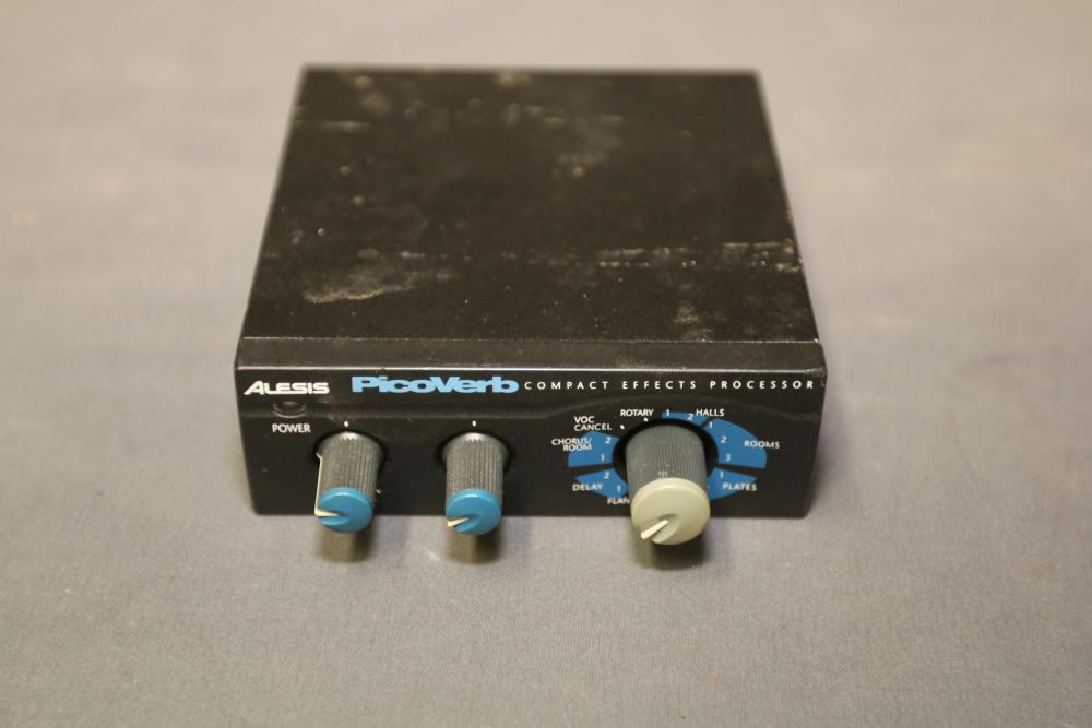 Alesis PicoVerb Compact Effects Processor. Compact design with functionality for audio effects processing. Features input, mix controls, and various effect options, including delay and reverb settings. Equipped with left/right output jacks and left/mono input jacks. Designed for 9VAC 830mA power. Condition shows signs of usage with some surface wear. Pickup only.
