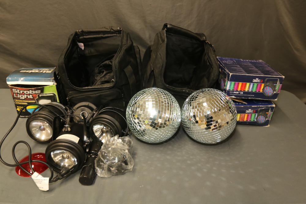 Stage Lighting Set Including Chauvet DJ SlimPar 38 LED Lights, two mirror balls with Arriba carrying cases, American DJ PL-1000 Pinspot Light, MBK-1 Pinspot Light with multicolored lenses, PIN-130 Pinspot Light, Amscan SDL-004 Strobe Light, and various mounting and hanging accessories. Includes all items shown in the photos. Pickup only.
