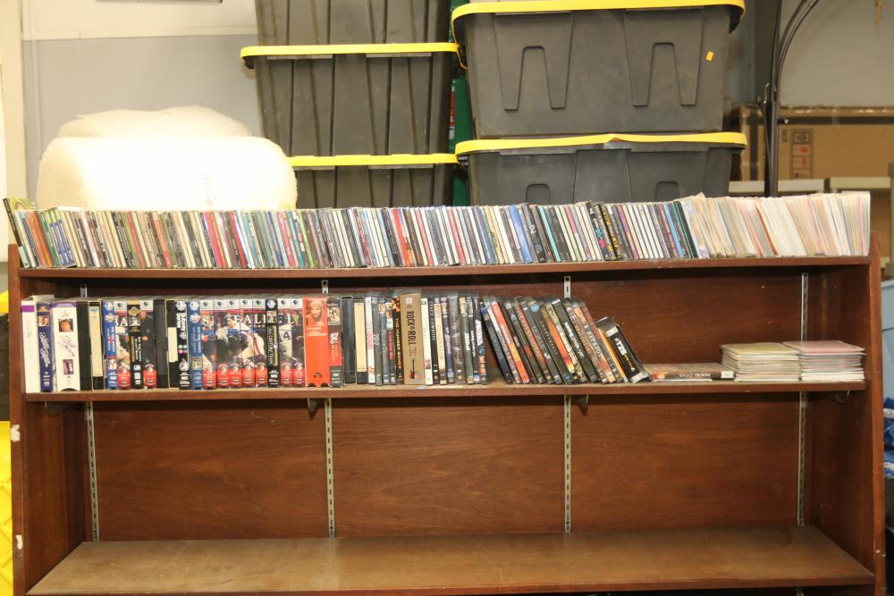 CDs, VHS tapes, and DVDs featuring diverse musical artists, films, and television series. Includes a variety of music albums, classic VHS titles, and DVDs from different genres and themes. Pickup only.