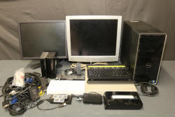 Desktop PC Bundle with Dell Inspiron 570 desktop PC, a Dell 17 inch LCD monitor, a Gateway 18 inch LCD monitor, a Logitech Bluetooth keyboard, and a Targus 16 inch Dual Fan Chill Mat. Includes an Interex Master Computer Power Strip Surge Protector, multiple Western Digital portable external hard drives ranging from 500GB to 1TB, a Seagate 1TB external hard drive, two GL.iNet Mini Smart Routers, a Cyber Acoustics computer speaker, and a Netgear AC6210 High Gain WiFi adapter. Also features various cables including power supply, VGA, and USB cables. Pickup only.