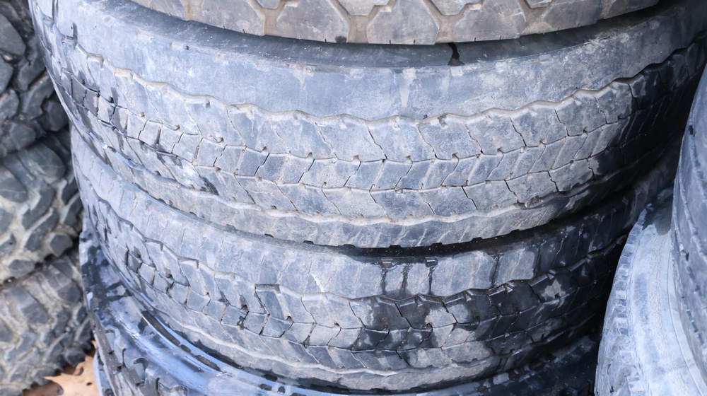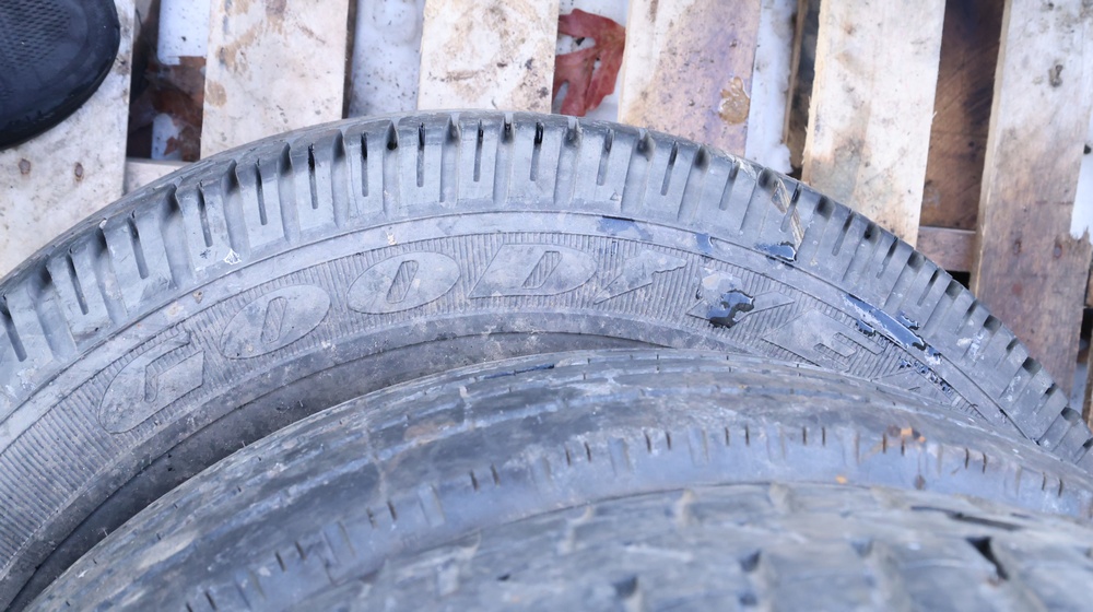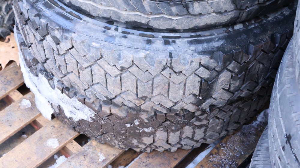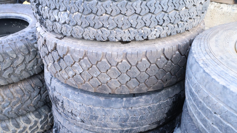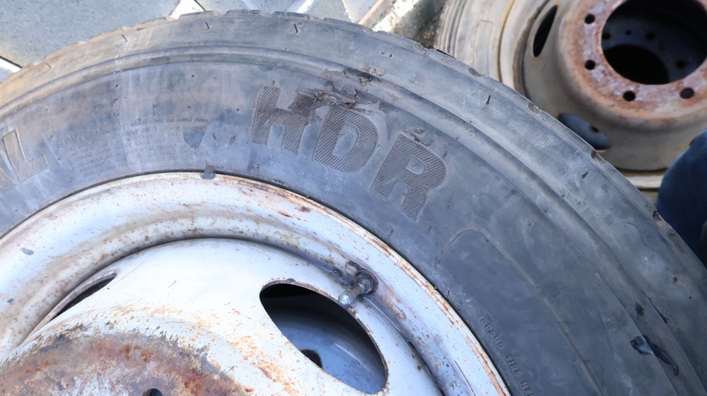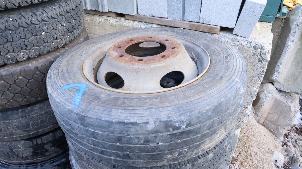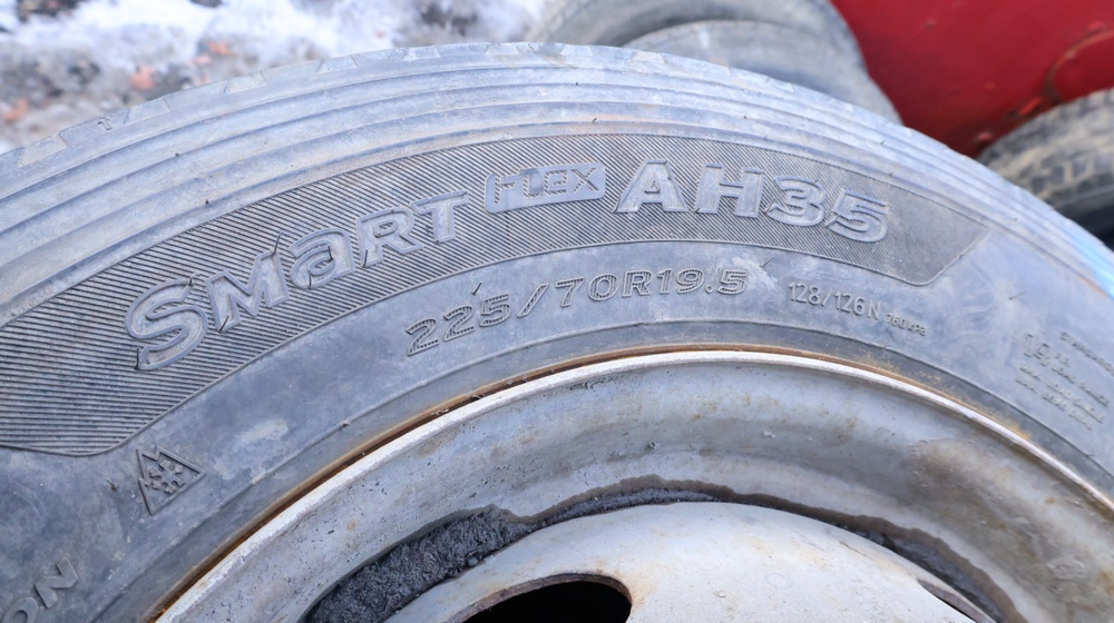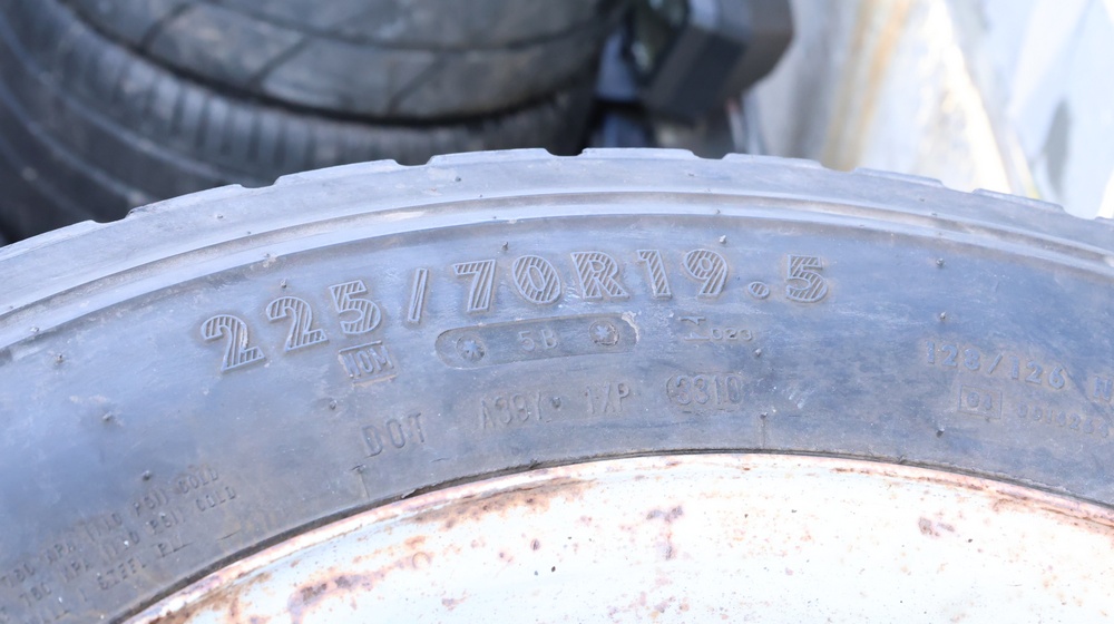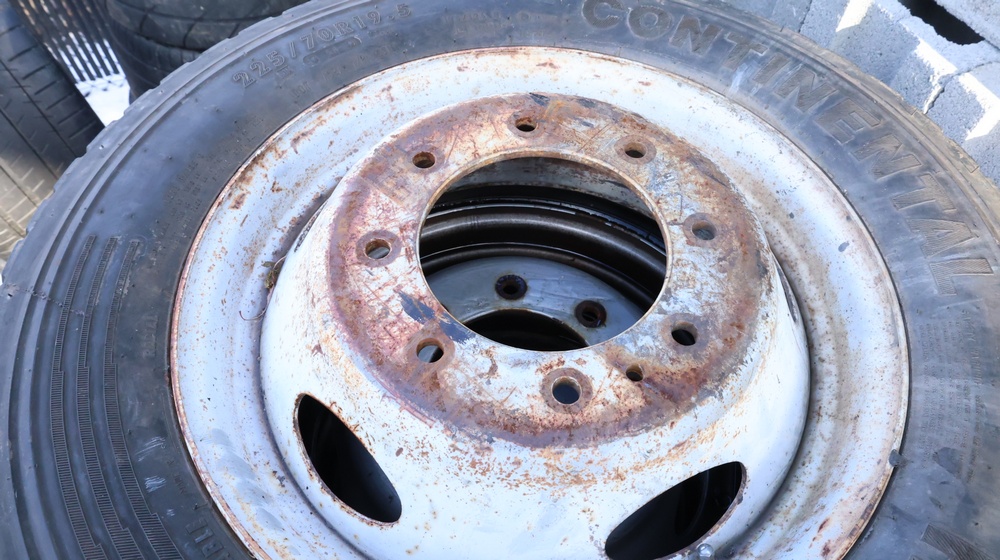 Selection of tires mounted on 10-lug steel rims, all removed from a Ford F-550. Tires include Hankook Smart Flex AH35 (225/70R19.5), Continental HDR (225/70R19.5), and Goodyear models, among others.