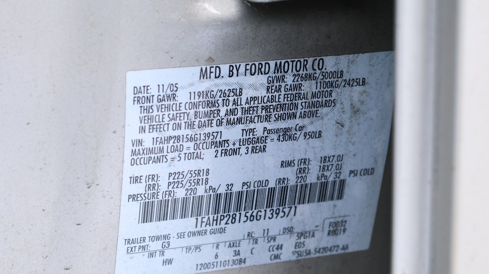 2006 Ford Five Hundred with a 3.0L V6 DOHC 24V engine. VIN: 1FAHP281X6G173943. Odometer reading: 83870.