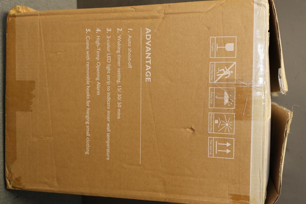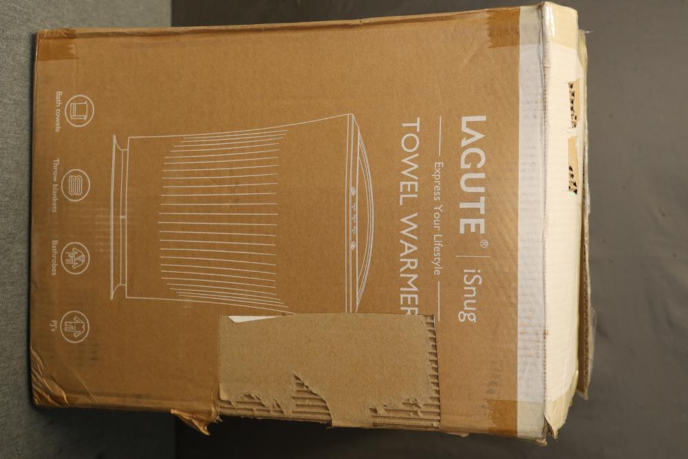 Lagute iSnug Towel Warmer designed for heating and warming towels, featuring auto shut-off, waiting timer settings of 15/30/50 minutes, and a 3-color LED light strip to indicate the inner wall temperature. Includes a high-temperature opening alarm and removable hooks for smaller clothing or accessories. Pickup only.
