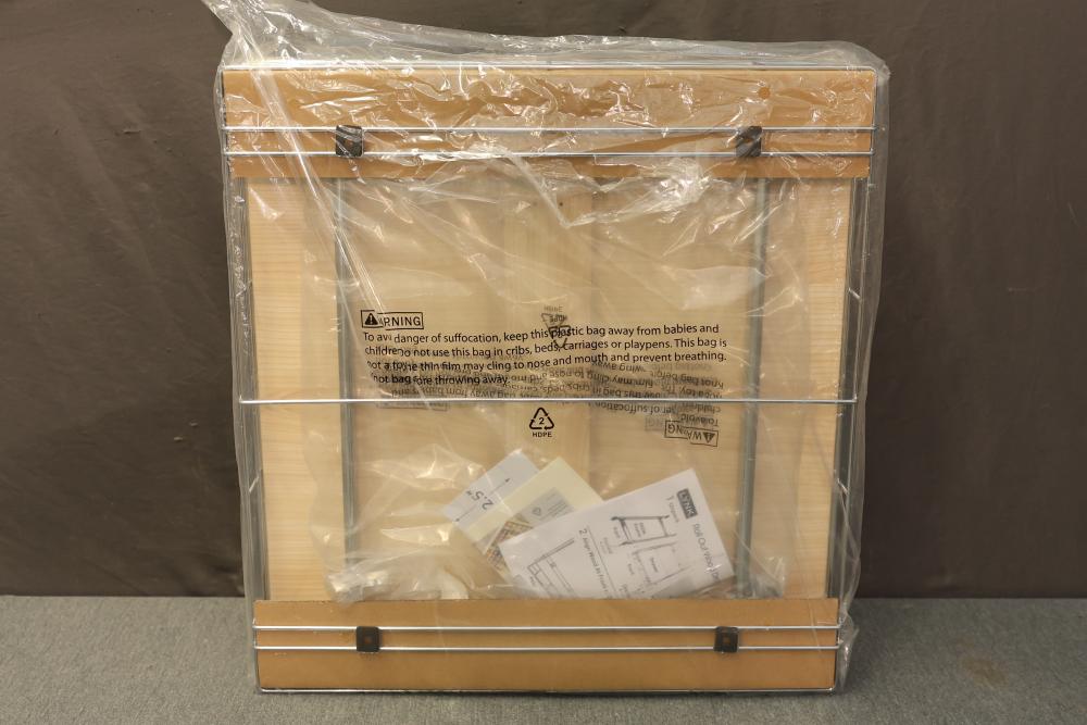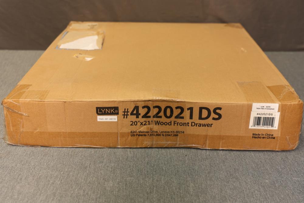 Lynk 422021DS 20 Inch x 21 Inch Wood Front Drawer. Featuring a metal wire frame and wood front panel, this storage drawer is designed for organizing cabinets or storage spaces. It is in the original packaging, showing minimal signs of handling. Pickup only.
