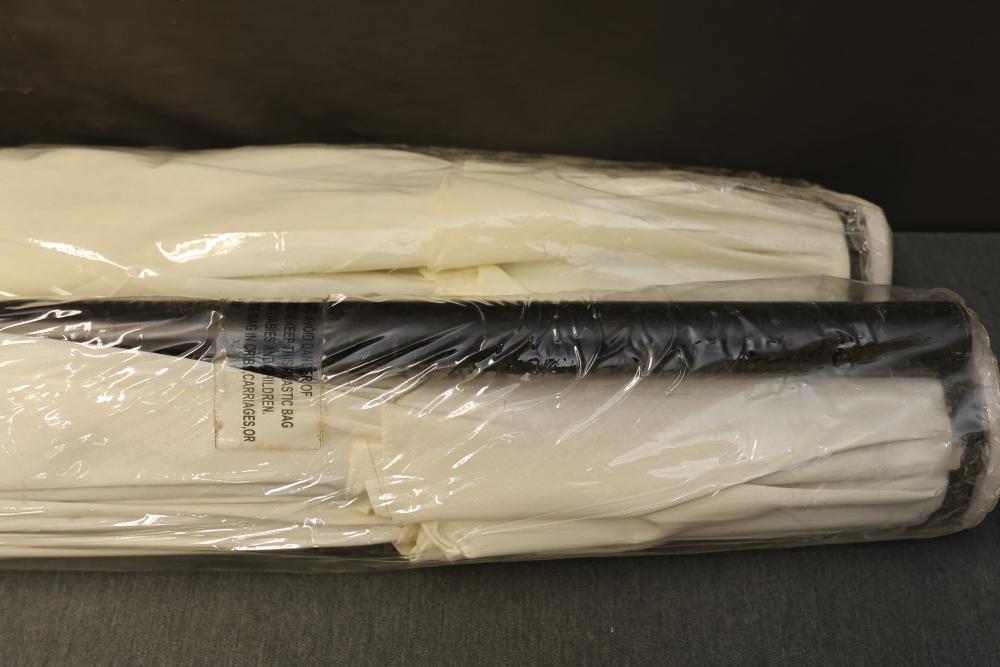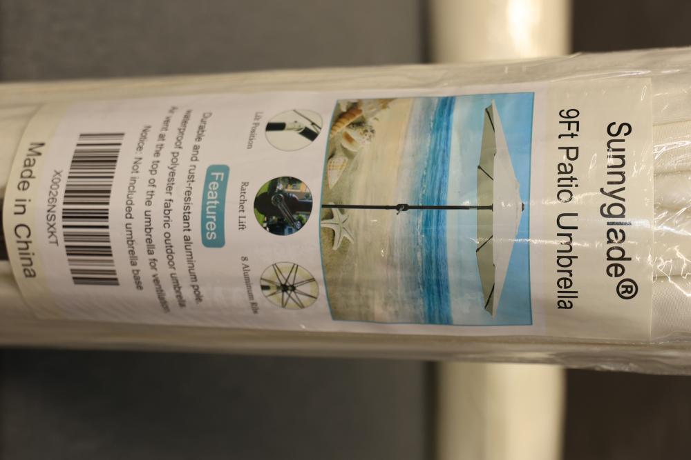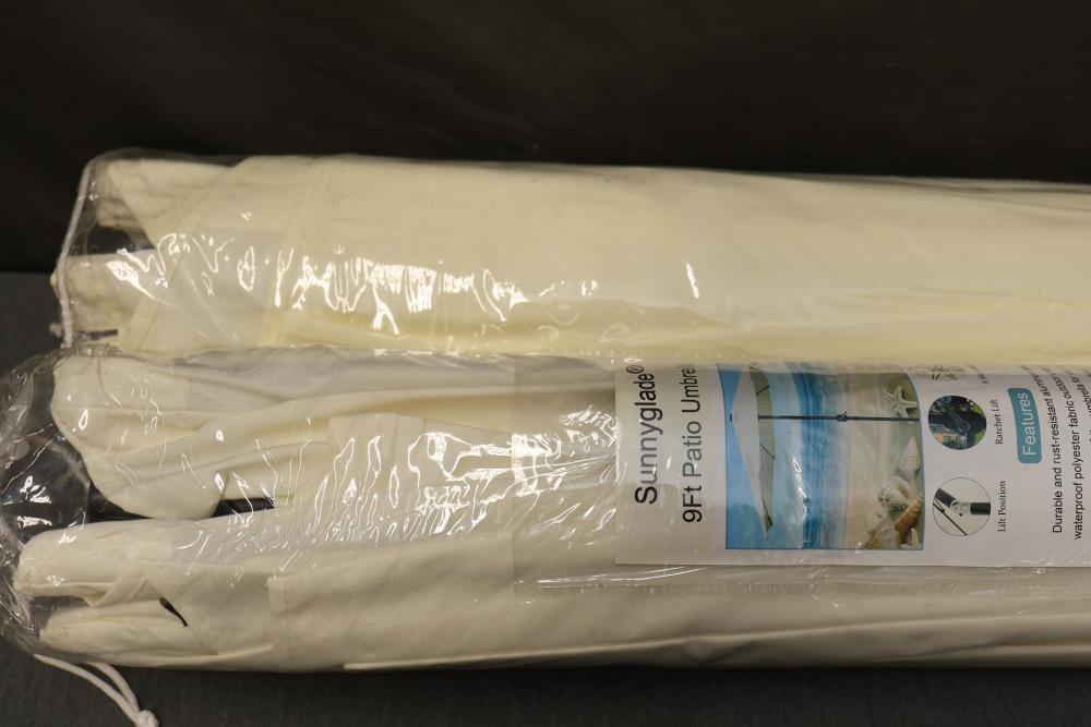 Sunnyglade 9 Foot Patio Umbrella, Cream Colored, Quantity of 2. Includes two durable, rust-resistant aluminum pole patio umbrellas with cream-colored waterproof polyester fabric covers. Designed for outdoor use with crank lift operation and 8 steel ribs for stability. Umbrella bases not included. Pickup only.